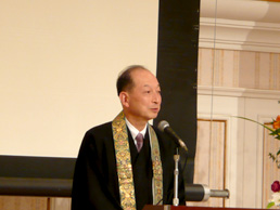 次に、ご来賓として、浄土真宗第二十四代ご門主 大谷光真氏にご臨席賜り、ご挨拶をいただきました。非暴力の姿勢は仏教の根本的立場であり、縁起思想に依拠しながら、我がものという固定的な考え方を反省し、世界全体がつながっているからこそ、一人ひとりが責任を持って生きていく重要性を提言されました。
