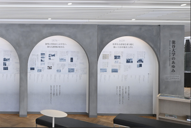 龍谷大学の歴史を創設の1639年から2020年代までを5つに分けて展示しています。年表とともに、本学のあゆみを示す主な出来事(トピック)を写真に説明書きで解説を加えています。