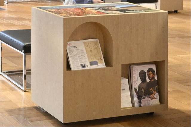 本学が所有する龍谷ミュージアムの情報を集約したインフォメーションボックス。過去の図録や最新の企画展のチラシ、広報誌でのインタビュー記事を展示しています。また、天板には、NHKと龍谷大学の共同プロジェクトとして制作した仏教壁画の高精細デジタル復元などの写真も掲載しています。