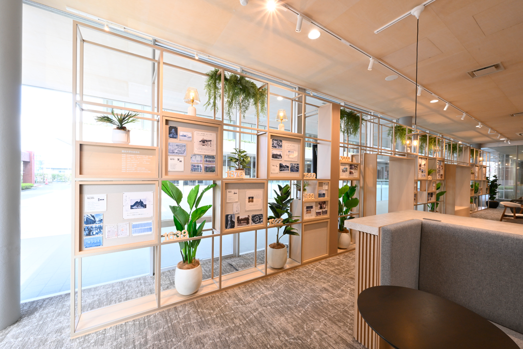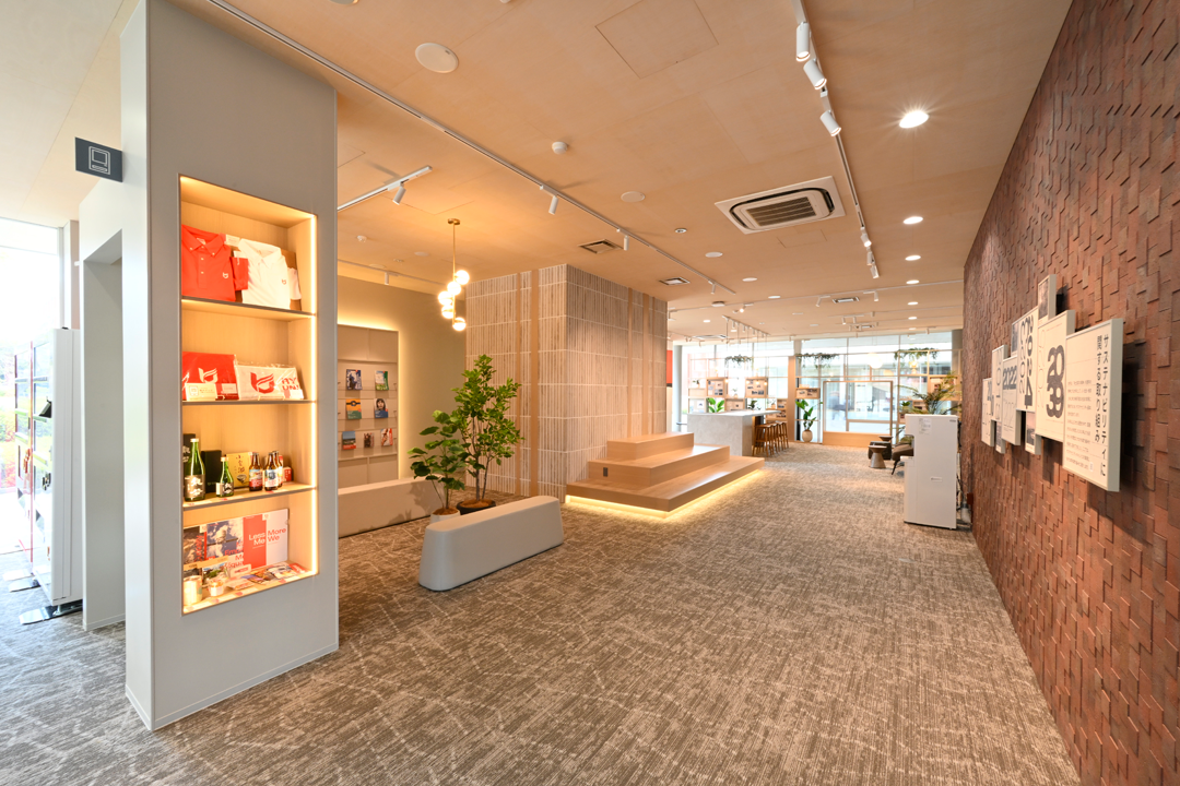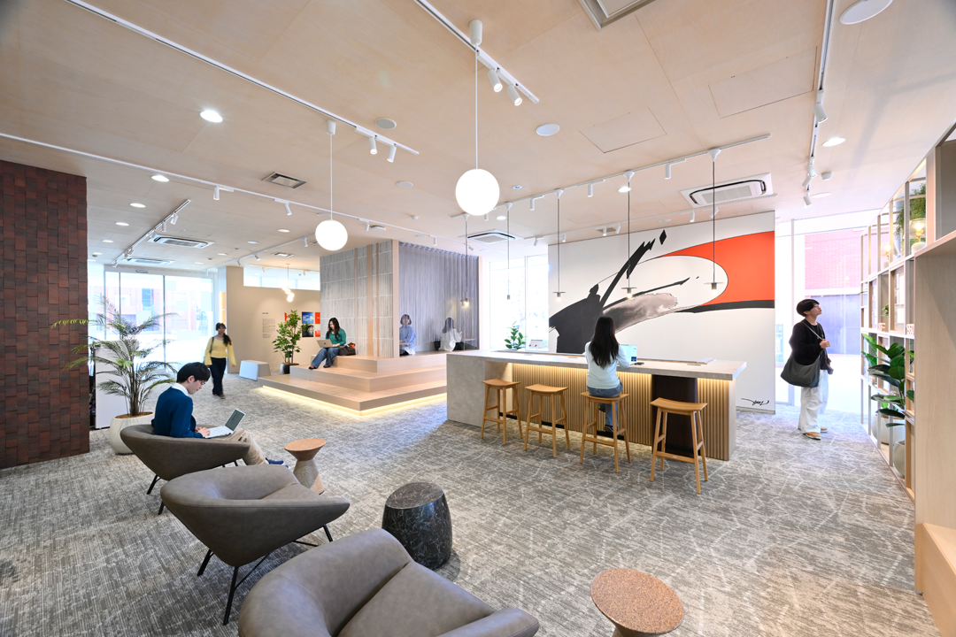 学内外問わず誰もが利用でき、利用者が交流し学びを深める場です。館内では本学の歴史や学生の挑戦を紹介し、本学の進取の姿勢と伝統を体験できる展示を行っています。また、交流・展示・居場所・イベントなど多機能を備え、インテリアアイテムやデザインなど誰しもがリラックスして利用できる空間となっています。深草キャンパスでは、龍谷大学の現在の姿をブランディングの要素も使って伝えるをコンセプトに空間を設えています。龍谷大学の魅力を体感し、新たなつながりを生む“体験空間”です。
