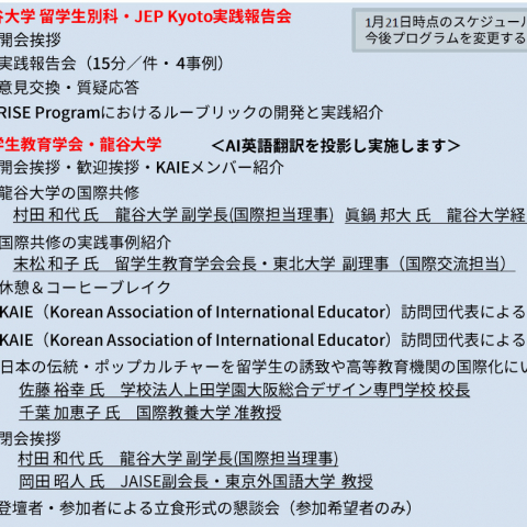 龍谷大学の留学生別科および交換留学生向けプログラム「Japanese Experience Program in Kyoto(JEP Kyoto)」での実践報告のほか、留学生教育学会日本文化委員会における「文化」を中心に据えた授業設計や国際共修に関する取り組みに加え韓国の大学における留学生誘致事例の紹介も交え、留学生教育の新たな視点やアイデアを得る会とします。