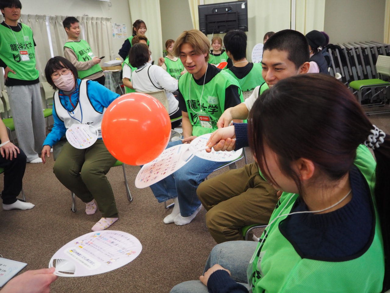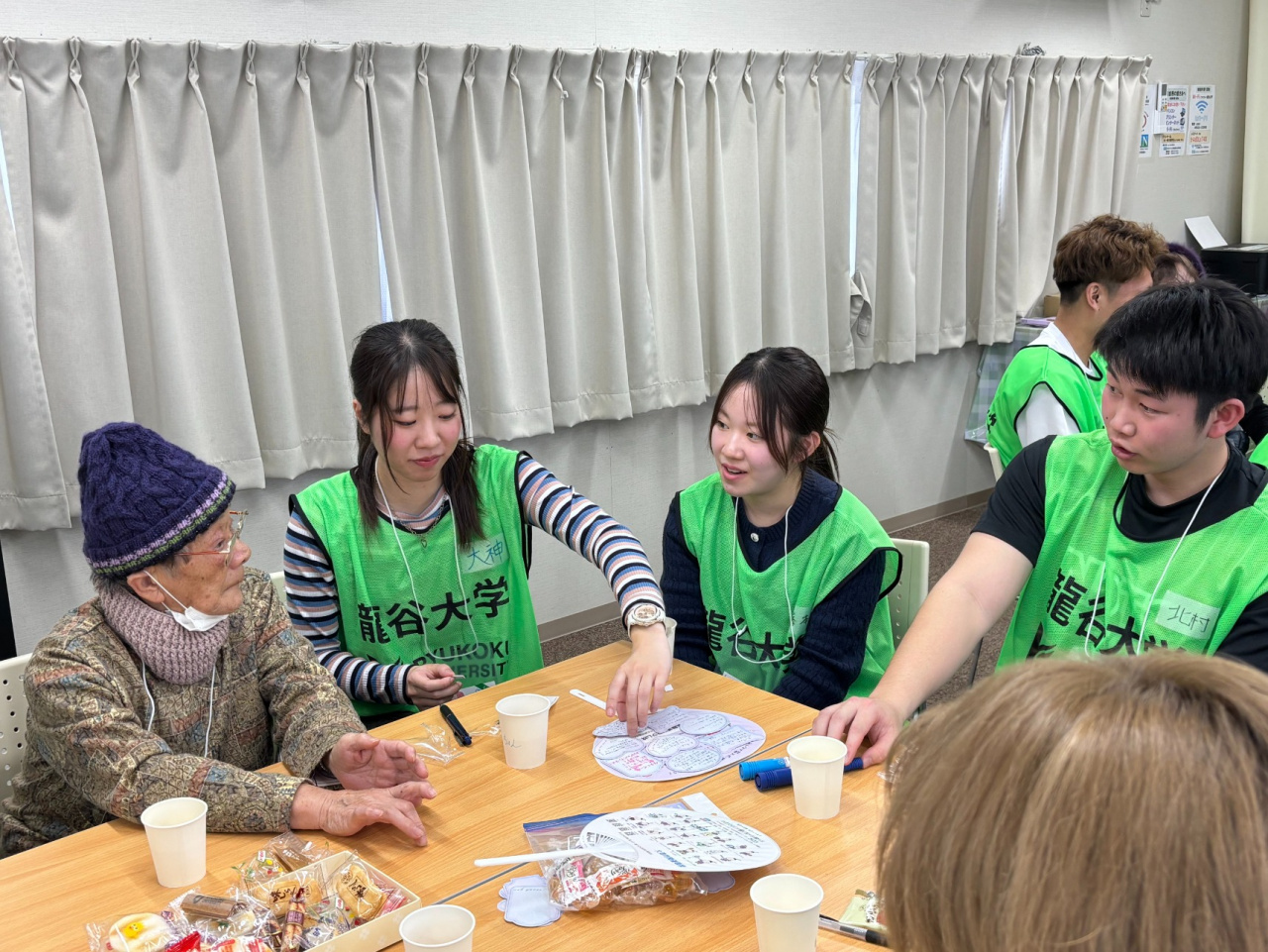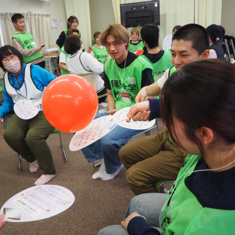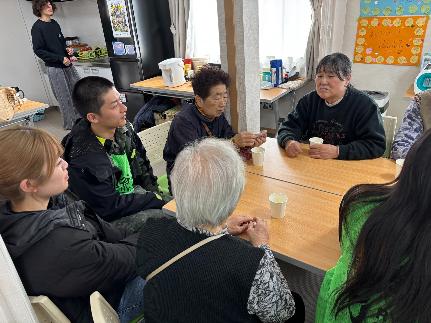 午前中は継続的に交流のある珠洲市内の蛸島第一団地仮設住宅でサロン活動。普段から住民の方と関わりのある『珠洲ささえ愛センター』の協力で、学生たち自身が住民の方に向けて呼び込みも行いました。風邪が流行っていた事もあり、いつもよりも少ない5名の方の参加に留まりましたが、その分、いつも以上に濃いコミュニケーションを取る事が出来ました。BGMの選曲、体操、ジェスチャーゲーム、風船リレーと事前に交流内容を学生たち自身で企画し、当日の参加人数に合わせて臨機応変に進行しました。とてもいい交流をすることが出来ました。