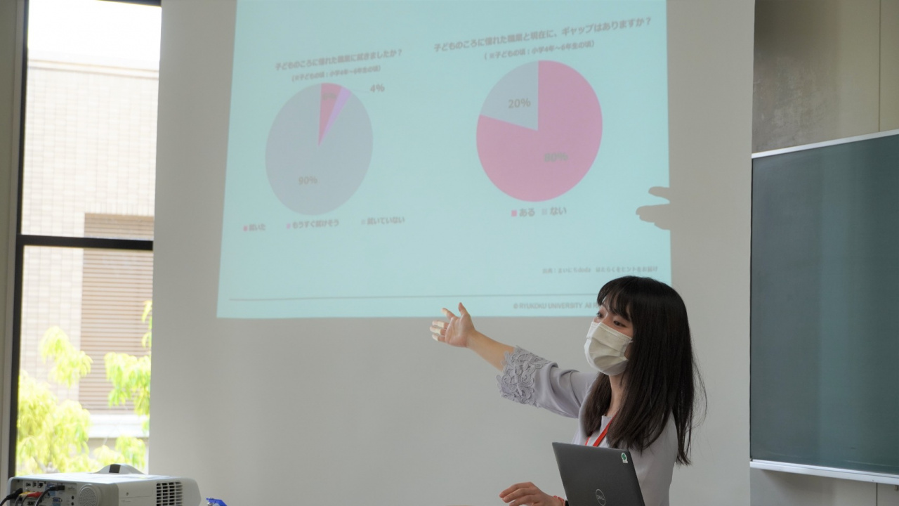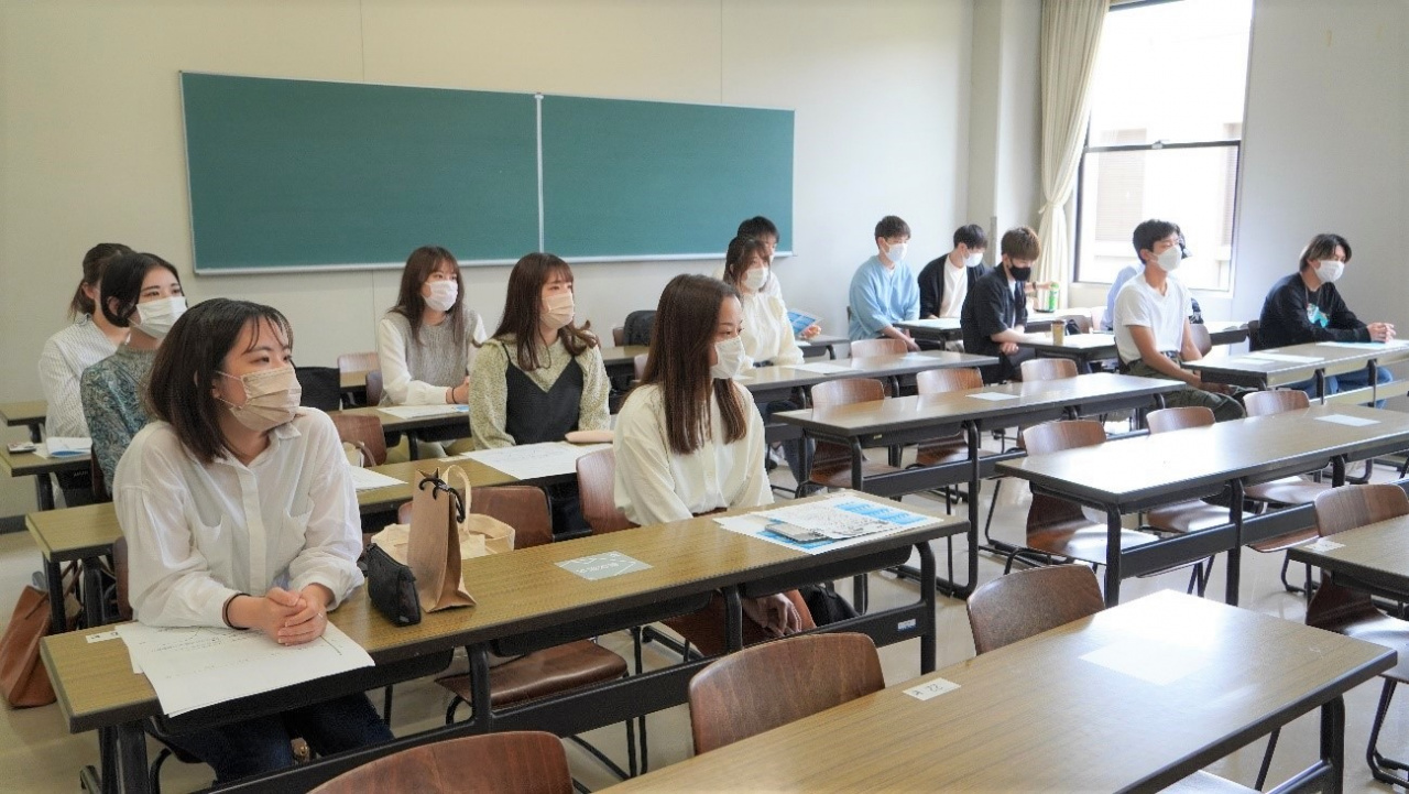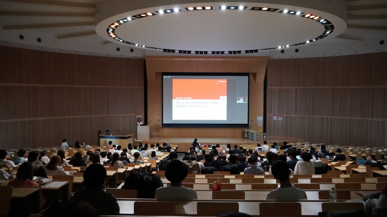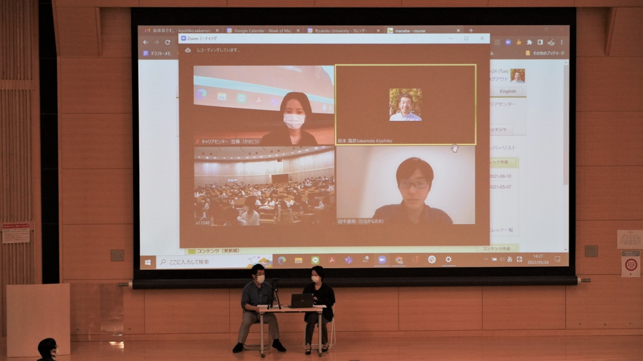 自分の持ち味を把握するためにも大学時代に幅広い経験をすべきこと、将来について考えるためキャリアセンターや龍大就職ナビ(龍ナビ)を積極的に使ってほしいことなどのアドバイスもありました。