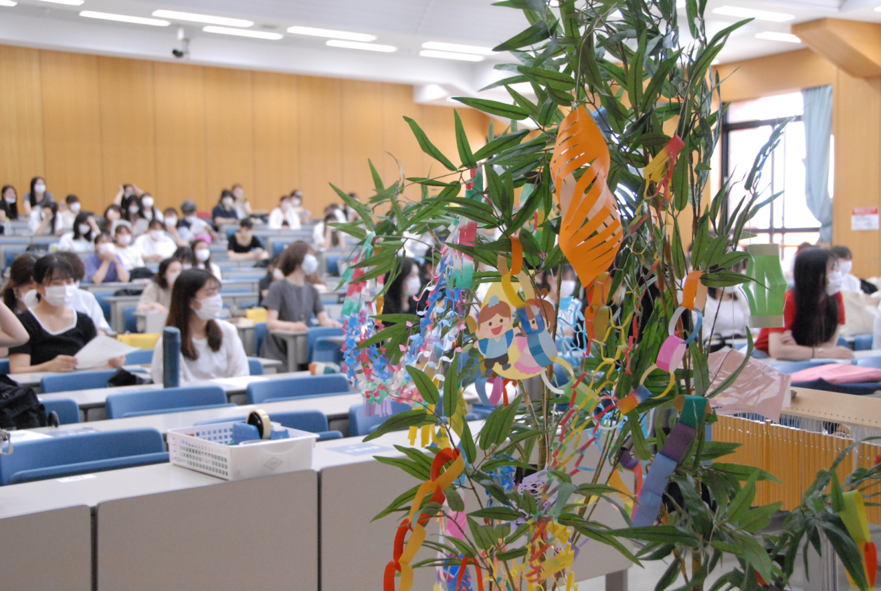 7月6日(水)3講時「教育実習」の授業において、こども教育学科2年生と教職員で「たなばた会」を開催しました。保育・幼児教育の現場では季節や行事にちなんだ保育活動を行いますが、具体的な行事を保育にどのように取り入れるのかを学生が体験的に学ぶ機会となりました。保育現場では、保育実践力として身体表現・歌唱指導、児童文化財の実演などが求められますが、教員が行事に取り組む姿を見せることで、学生の学修意欲を高めたいと考えました。