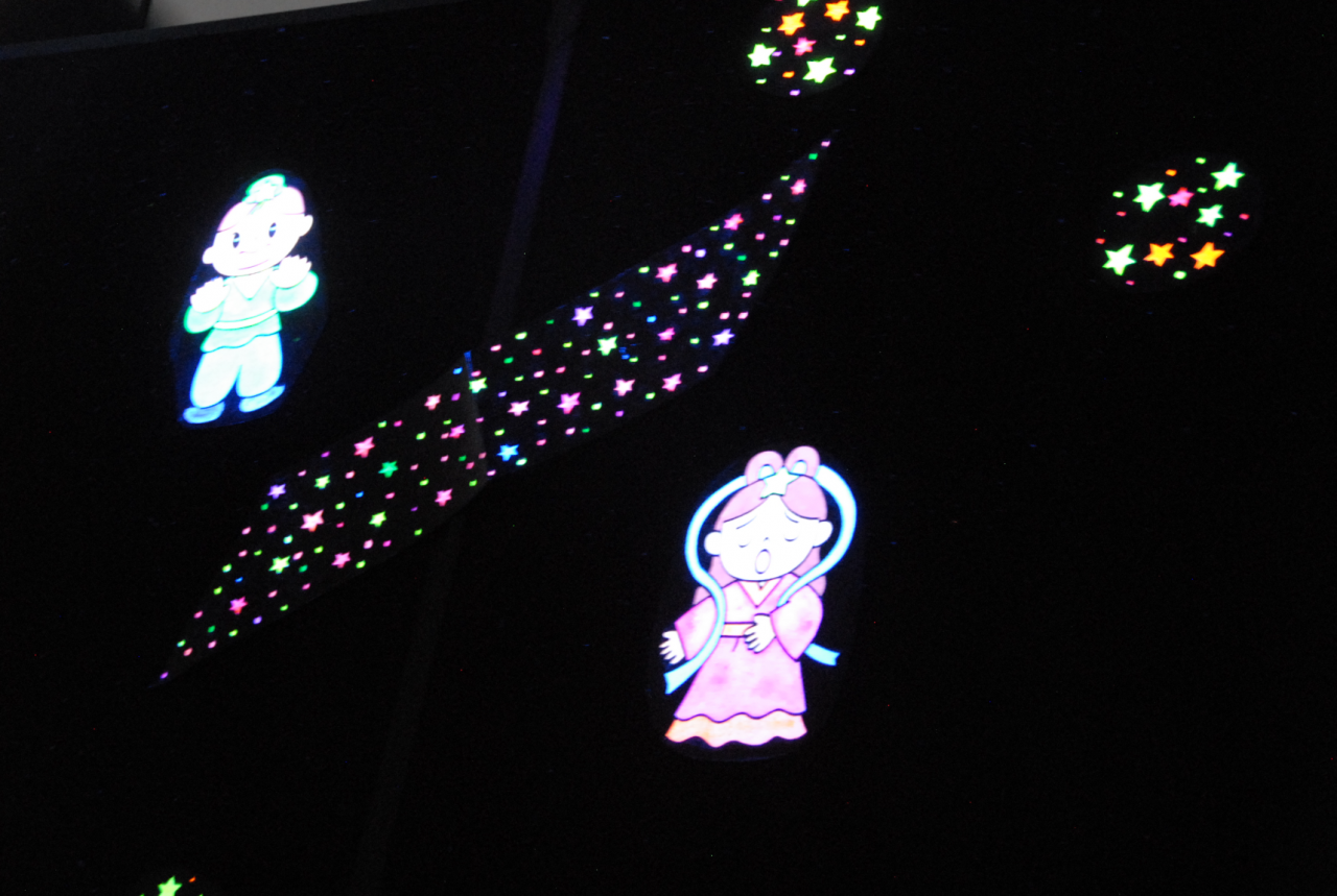 学生たちは七夕伝説のブラックパネルシアターを鑑賞し、折り紙の笹飾りを作って飾り、短冊に願いごとを書き、「たなばたのうた」の合奏、星になって踊る身体表現、七夕にまつわる食文化を学びました。笑顔あふれる楽しいたなばた会となりました。