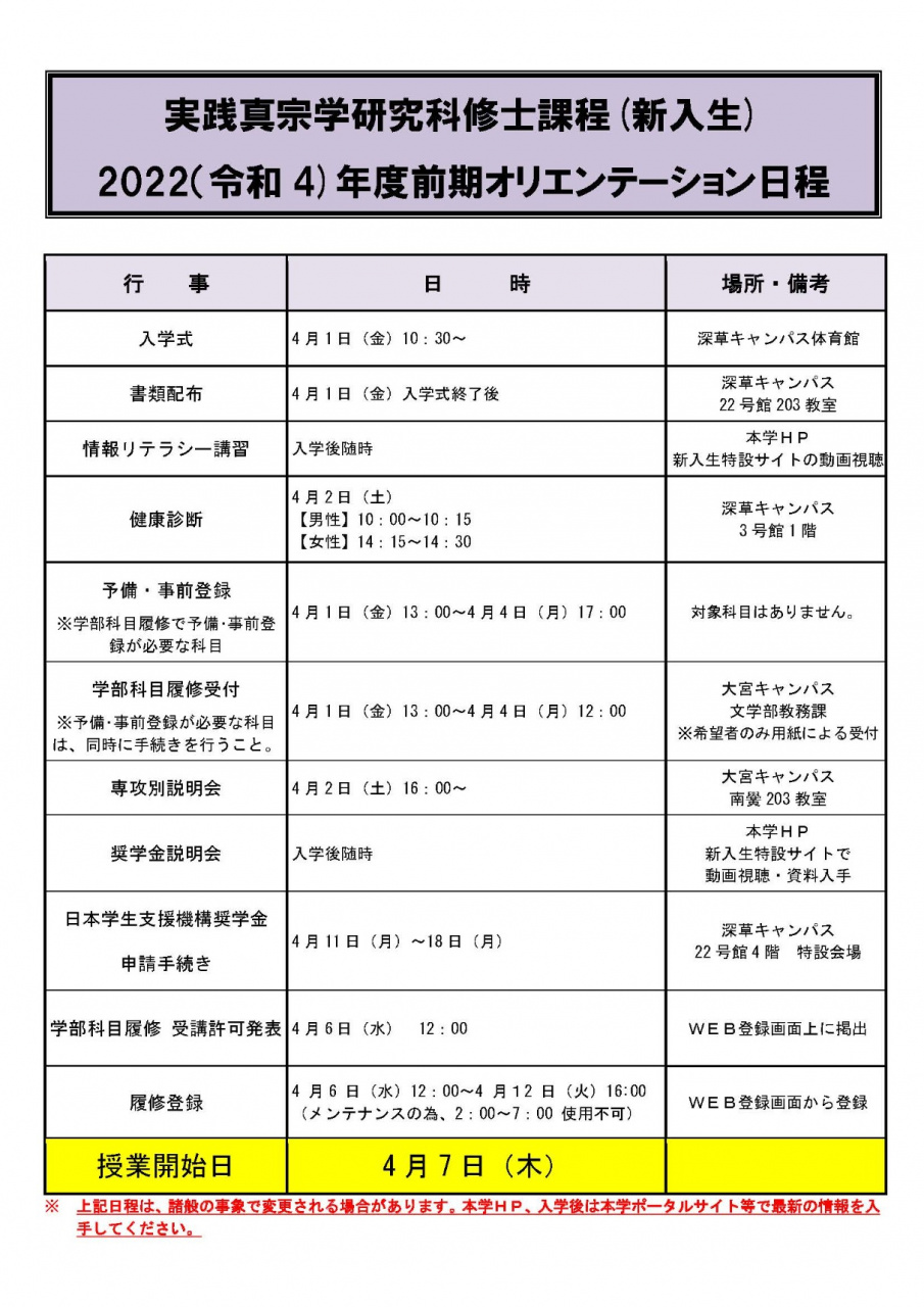 2022年度入学生 オリエンテーション日程のご案内【実践真宗学研究科】