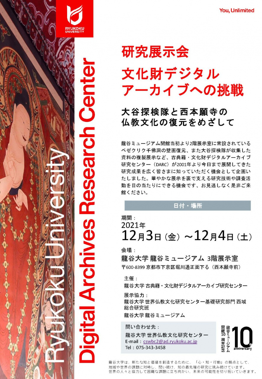 「文化財デジタルアーカイブへの挑戦」は、龍谷ミュージアム開館当初より2階展示室に常設されているベゼクリク千佛洞の壁画復元、また大谷探検隊が収集した資料の復元展示など、DARCが2001年より今日まで展開してきた研究成果を皆さまに広く知っていただく機会として企画されました。
