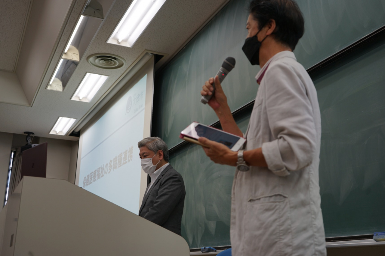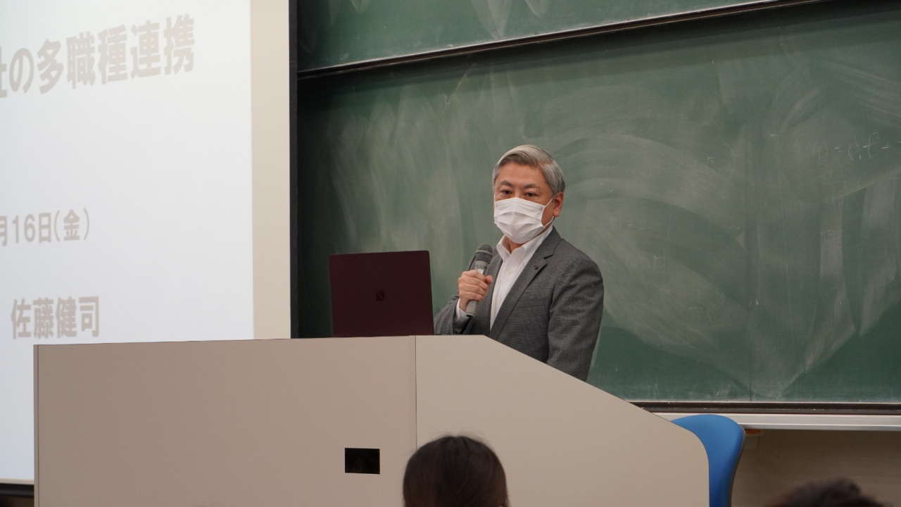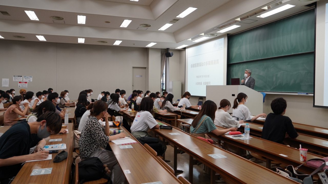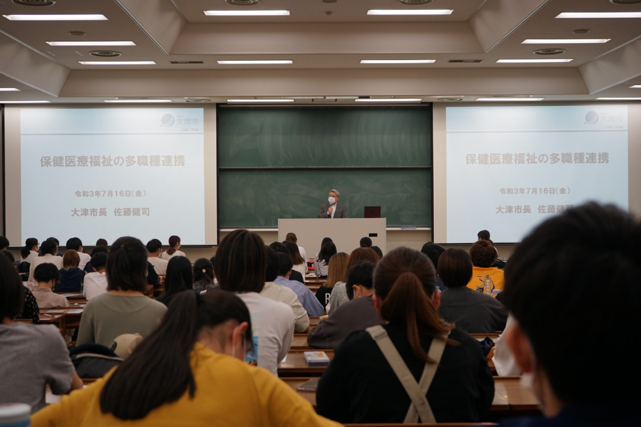 「保健医療論」(担当教員:本学名誉教授 安西将也先生)では、7月16日に大津市長の佐藤健司氏にお越しいただき、「多職種連携」をテーマに行政長としてご講義いただきました。