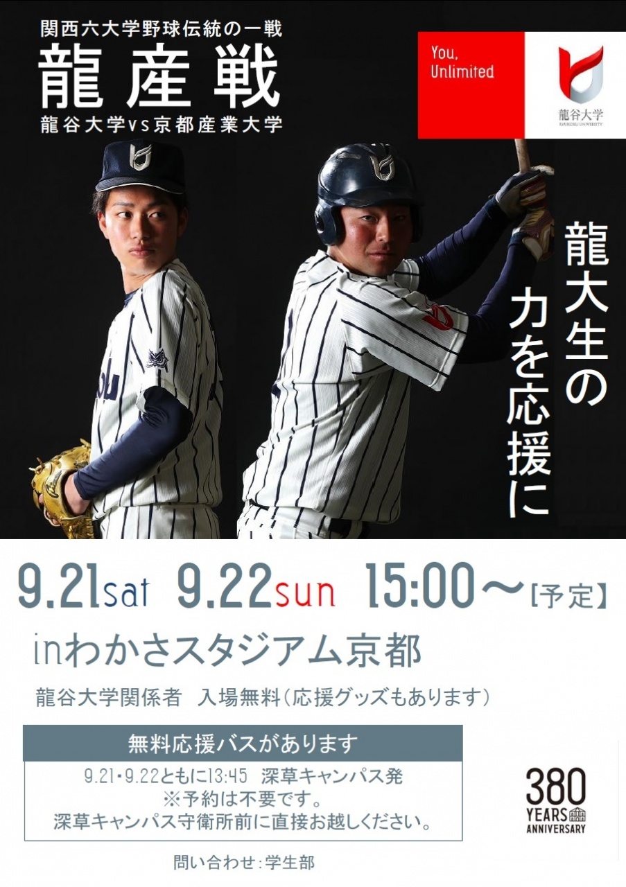 9月21日(土)15:00~(わかさスタジアム京都) 龍谷大学関係者入場無料