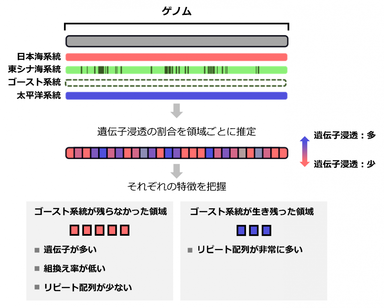 ◆絶滅したゴースト系統由来のゲノムが受け継がれたゲノム領域や、逆にゴースト系統由来のゲノムが失われてしまったゲノム領域の特徴を初めて解明しました。
