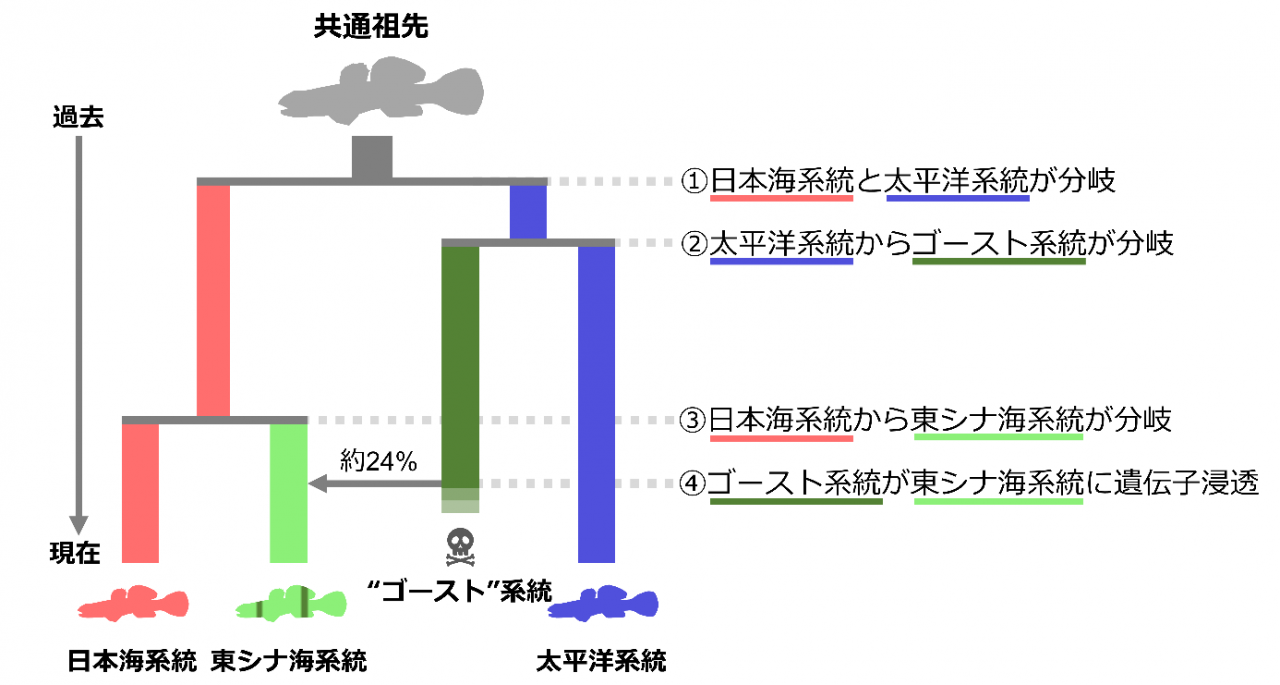 本研究では、アゴハゼ(Chaenogobius annularis)という魚類に着目し、この困難な課題に挑みました。アゴハゼは日本列島周辺の岩礁性海岸に生息する小型のハゼ科魚類で、海水浴場の磯遊びでも簡単に観察できる普通種です。これまでの分子系統地理学(注5)的研究により、本種には過去の日本海隔離により誕生した日本海系統と太平洋系統、そしてこれら2系統の交雑で誕生した可能性がある東シナ海系統の3つの種内系統が発見されていました。特にこのうちの東シナ海系統は、日本海系統と太平洋系統の直接の交雑ではなく、太平洋系統に近縁なゴースト系統との交雑により誕生した可能性が疑われていました。そこで私たちは、この東シナ海系統のゴースト系統起源仮説を検証するとともに、ゴースト系統由来の遺伝子浸透ランドスケープを特徴づけることを目的として、集団ゲノミクス解析を行いました。