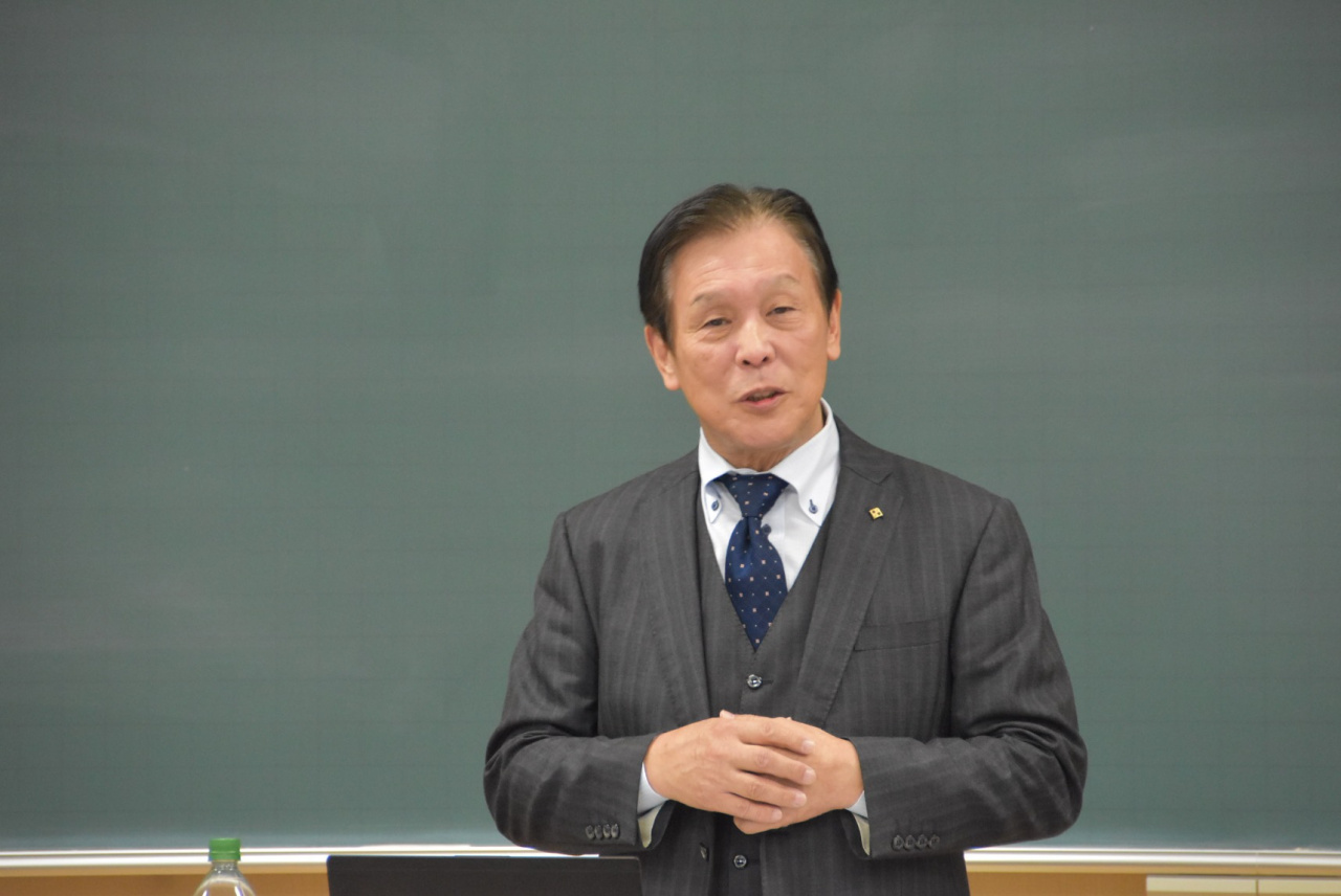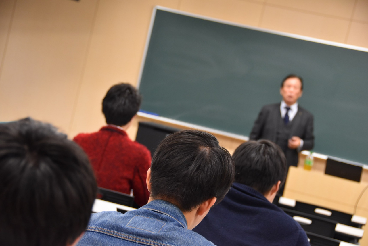 京都企業の経営者をお招きし、ご講演いただく経営学部の特別講義「我が社の経営と京都」では、経営者の経営哲学が経営戦略としてどのように具体化されているのか、あわせて京都という資源がどのように経営に生かされているのかを学生に把握してもらうことを到達目標にしています。