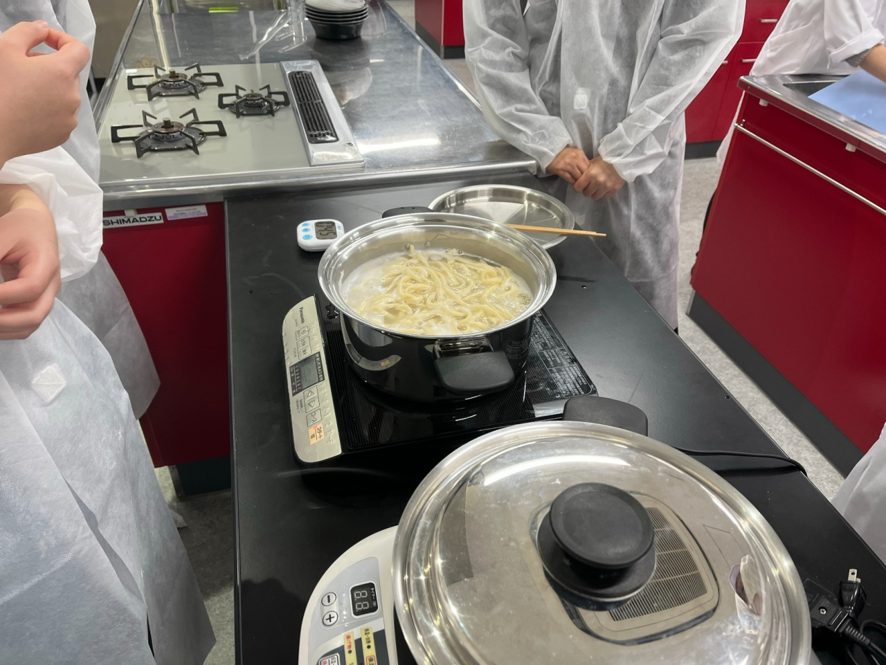 事前学修として日本におけるうどんとそばの違いや歴史を学び、実習では農学部食品栄養学科の先生方にサポート頂きうどんを打ちました。