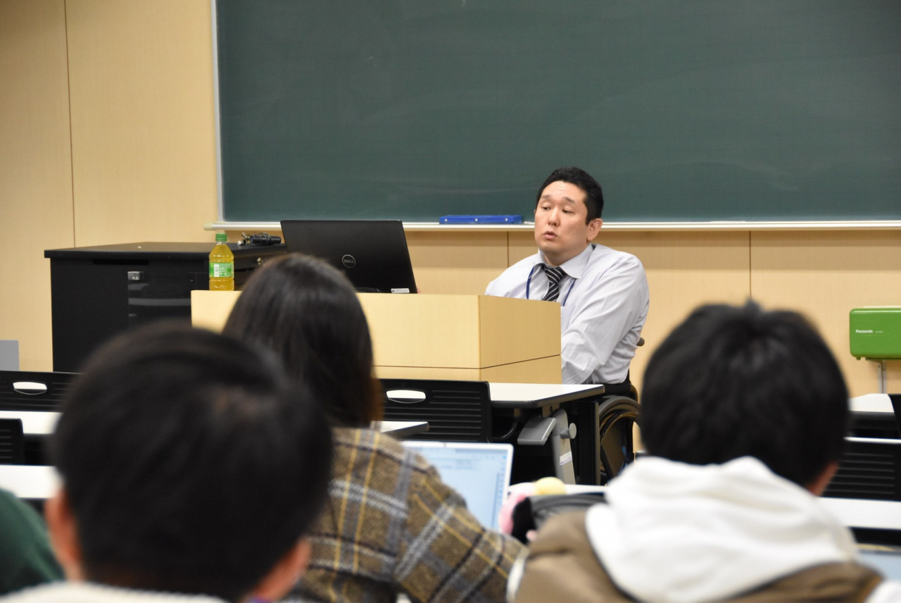 講義後の質疑応答では複数の学生から使われているツールのことや法定雇用率との関係などの質問が挙げられましたが、それらに対して詳しくお答えいただきました。授業後に提出する学生のコメントでは、車椅子に乗ったスーツの社会人の方が説明されているのを見て驚いた自分と同時に、誰もが働ける社会はまだ実現されていないことに気づかされたいう感想もありました。