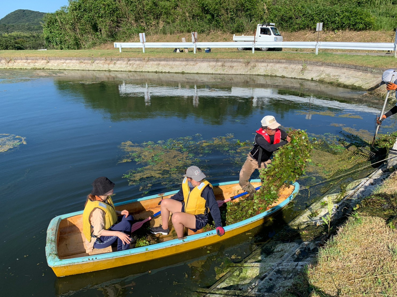 22日は、塔下新池を管理する田主(たず)の皆さんと池周辺の草刈り、水藻の除去を行いました。ライフジャケットを着てボートに乗り、藻を取る作業は人生初の体験です。