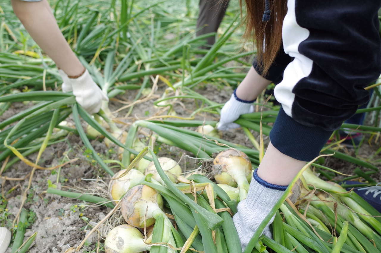 洲本市五色町鮎原塔下(あいはらとうげ)にある「塔下新池ため池ソーラー発電所」を見学し、田主(たず)の毛笠さんから圃場整備事業の歴史、塔下新池ため池ソーラー発電所の特徴、農業について話を聞きました。塔下新池は、1970 年代の圃場整備事業で茶畑だった場所に造成された人工池です。池を管理する田主の方々は、この地域で米や野菜を栽培しています。塔下地区では数年前から新たな圃場整備事業が進められ、訪れるたびに池周辺の田畑が姿を変えていました。見学のあとは近くの畑に移動し玉ねぎの収穫を体験、お土産にその玉ねぎをいただきました。