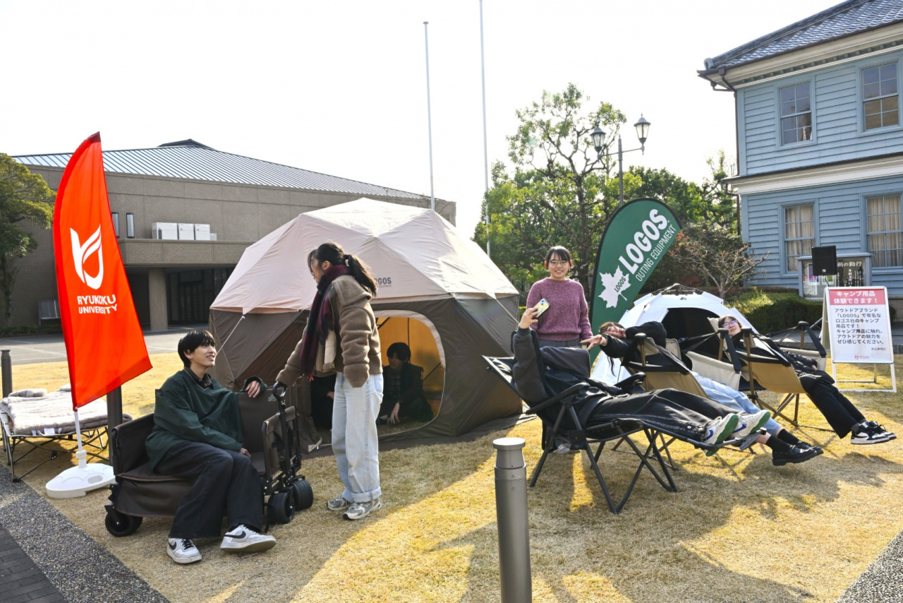 協定式後には学生がロゴス社のキャンプ用品に触れ、アウトドアの魅力を感じる機会を設けました。学生たちは興味深そうにキャンプ用品を手に取り、笑顔で体験を楽しむ姿が見られ、今後の取り組みにつながる前向きな時間となりました。