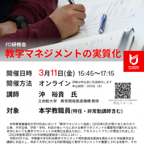 2022年3月11日(金)にFD研修会「教学マネジメントの実質化」をオンライ...