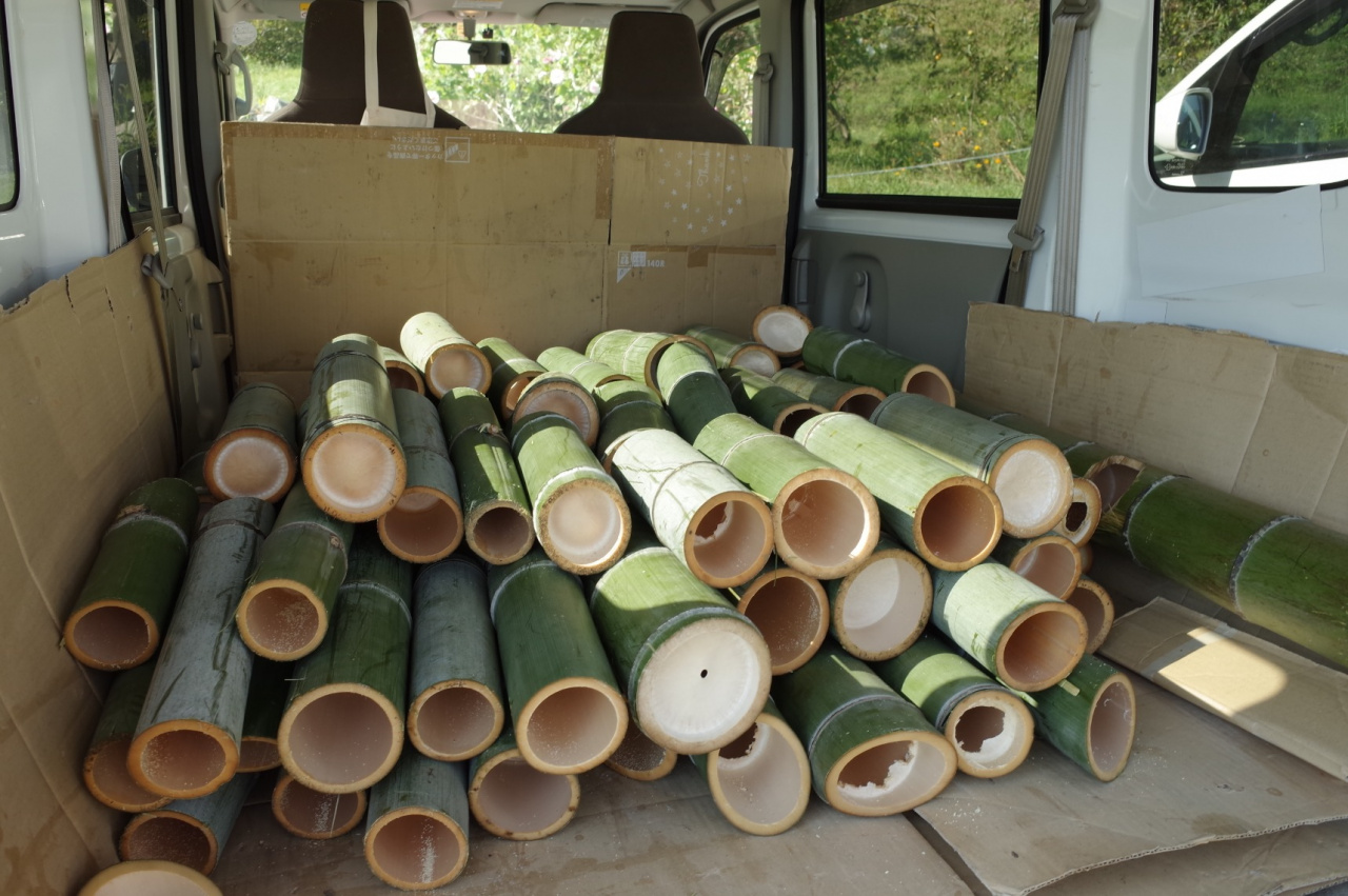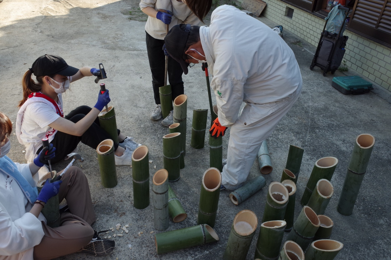洲本市安乎(あいが)町と千草竹原で、翌日開催する竹灯籠イベントの準備を行いました。あわじ里山プロジェクトの協力を得て、竹林から竹を切り出し35センチの長さに裁断していきます。80個ほど車に積み込んだあと千草竹原へ移動し、節をけずって筒状にする作業を行いました。