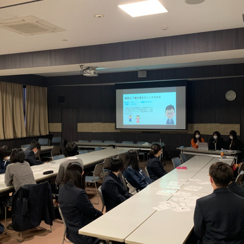 「お寺の可能性を引き出そう!―社会におけるお寺の役割を考える―」では、前期に京都府や滋賀県内にあるお寺に行き、お寺で開催されている日曜学校や食堂の取り組みにも参加しました。受講生は、お寺に対して「固い」「真面目」といったイメージを持っていましたが、意外とオープンで明るく、子どもや若者向けの活動もあるということを知ったとの気づきを発表しました。