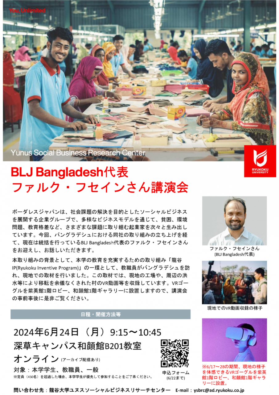 本取り組みの背景として、本学の教育を充実するための取り組み「龍谷IP(Ryukoku Inventive Program)」の一環として、教職員がバングラデシュを訪れ、現地での取材を行いました。この取材では、現地の工場や、周辺の洪水等により移転を余儀なくされた村のVR動画等を収録しています。VRゴーグルを紫英館1階ロビー、和顔館1階ギャラリーに設置しますので、講演会の事前事後に是非ご覧ください。