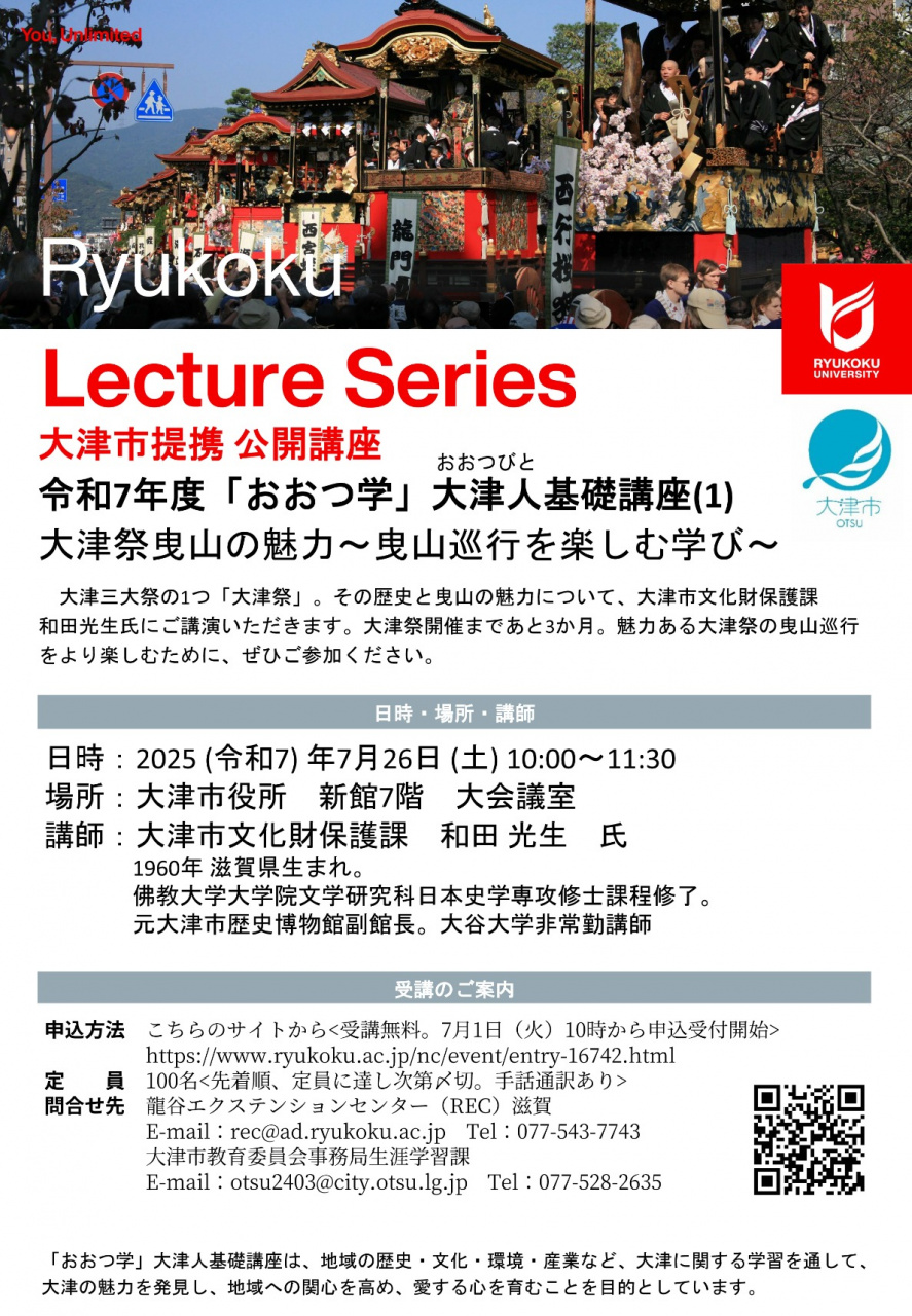 | お問い合わせ | 龍谷エクステンションセンター(REC)滋賀 rec@ad.ryukoku.ac.jp 077-543-7743 大津市教育委員会事務局生涯学習課 otsu2403@city.otsu.lg.jp 077-528-2635 |