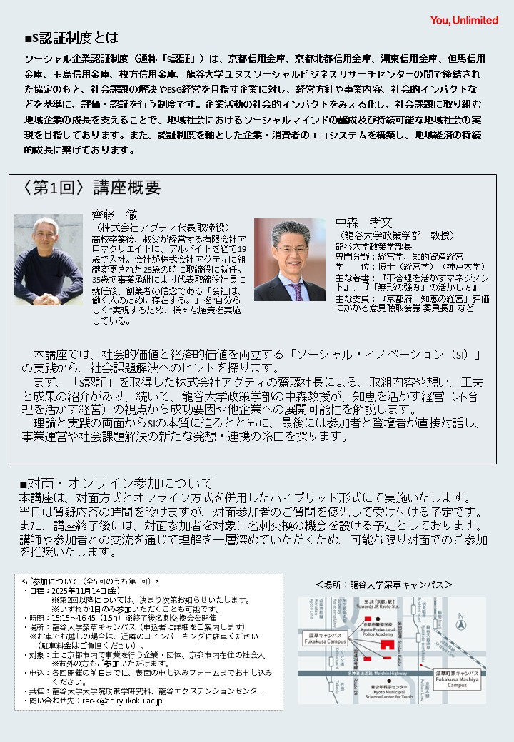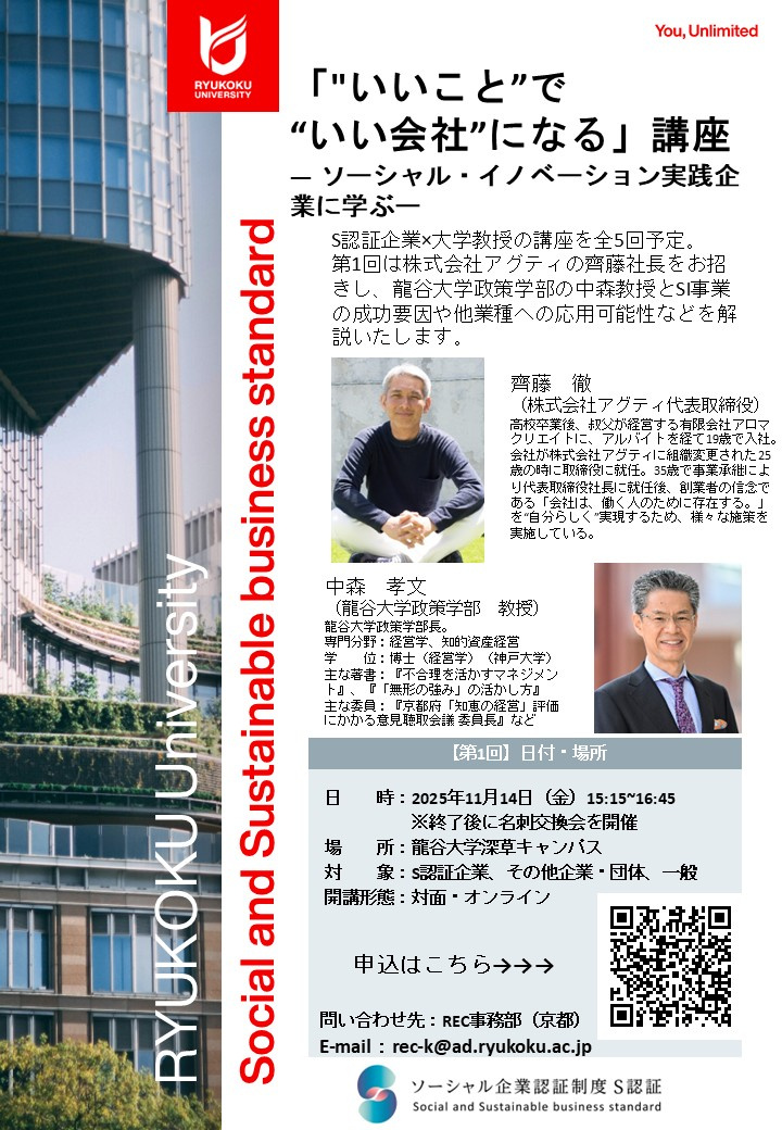 第1回は、S認証企業である株式会社アグティの齊藤徹社長をお招きし、龍谷大学政策学部の中森孝文教授とともに、ソーシャル・イノベーション事業の成功要因や他業種への応用可能性について語ります。