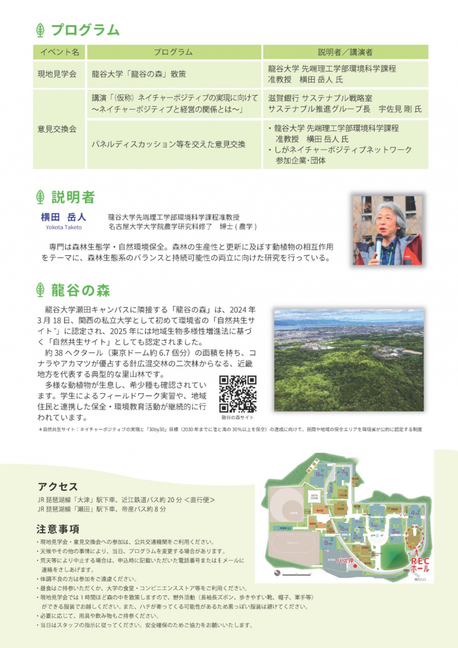 この度、しがネイチャーポジティブネットワークの取組みとして、現地見学会と意見交換会が開催されることになり、第1弾の会場として、龍谷大学瀬田キャンパスが選定されました。