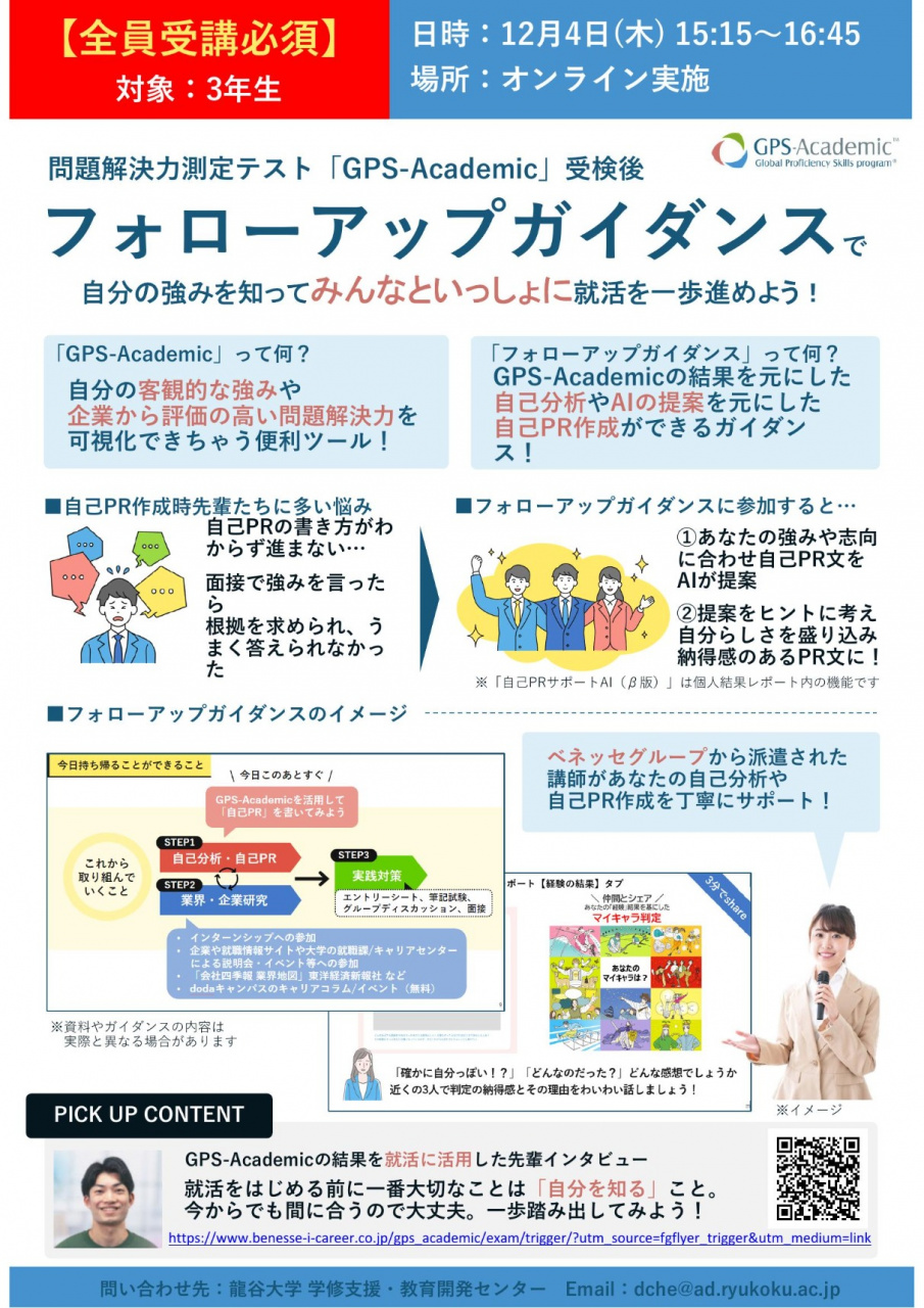 みなさんが受検された問題解決力測定テスト「GPS-Academic」のフォローガイダンスをオンラインにて開催します。