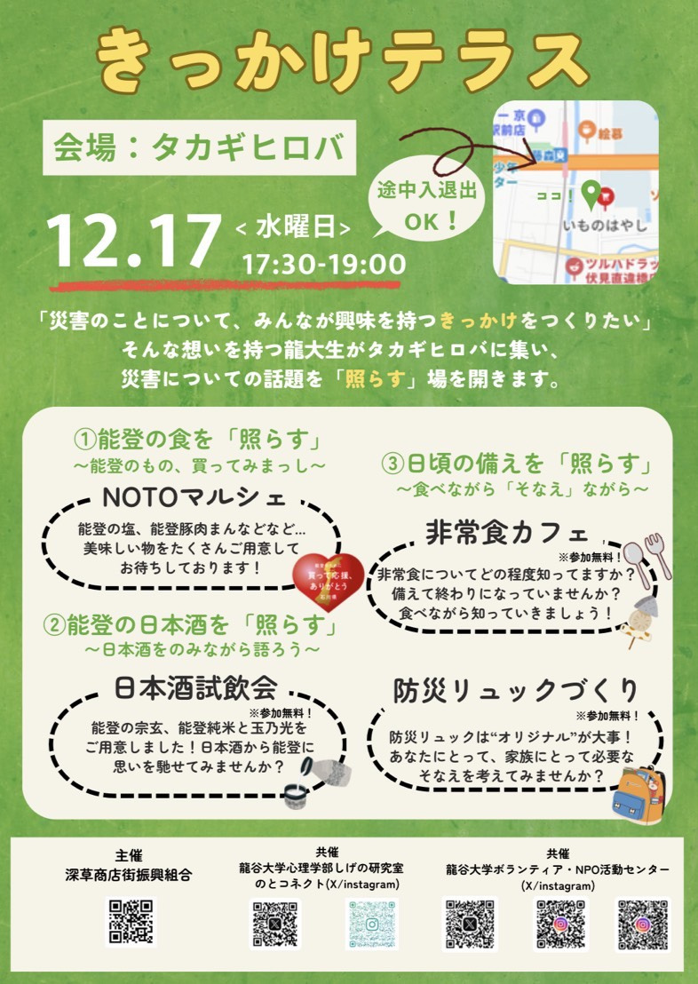 「災害のことについて、みんなが興味を持つきっかけを作りたい」そんな想いを持つ龍大生がタカギヒロバに集い、災害についての話題を「照らす」場を開きます。