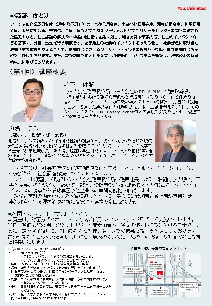 まず、「S認証」を取得した株式会社毛戸製作所の毛戸社長による、取組内容や想い、工夫と成果の紹介があり、続いて、龍谷大学政策学部の的場教授と対談形式で、ソーシャルビジネスの視点から成功要因や他企業への展開可能性を解説します。