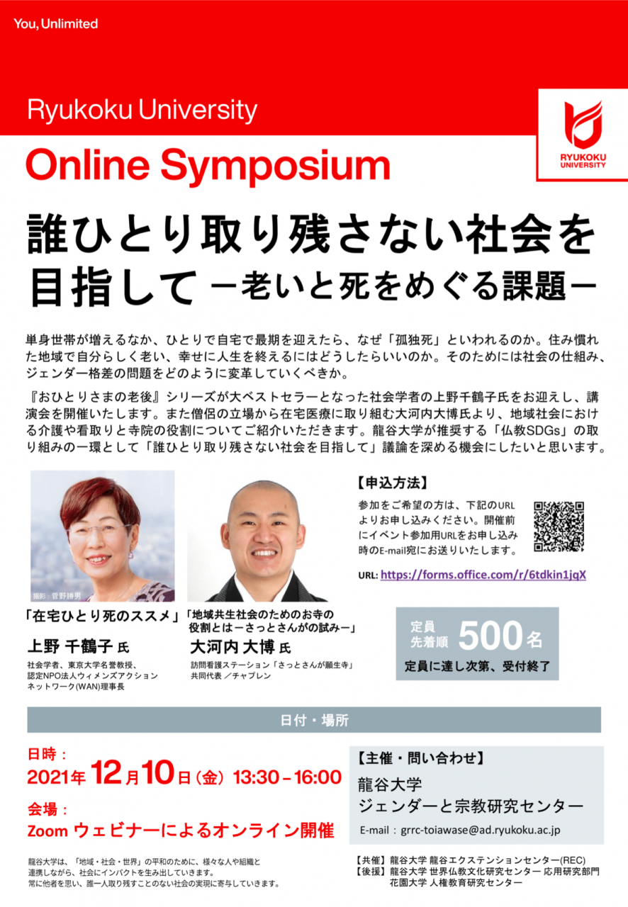 『おひとりさまの⽼後』シリーズが⼤ベストセラーとなった社会学者の上野千鶴⼦⽒をお迎えし、講演会を開催いたします。また僧侶の⽴場から在宅医療に取り組む⼤河内⼤博⽒より、地域社会における介護や看取りと寺院の役割についてご紹介いただきます。⿓⾕⼤学が推奨する「仏教SDGs」の取り組みの⼀環として「誰ひとり取り残さない社会を⽬指して」議論を深める機会にしたいと思います。