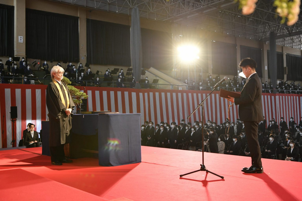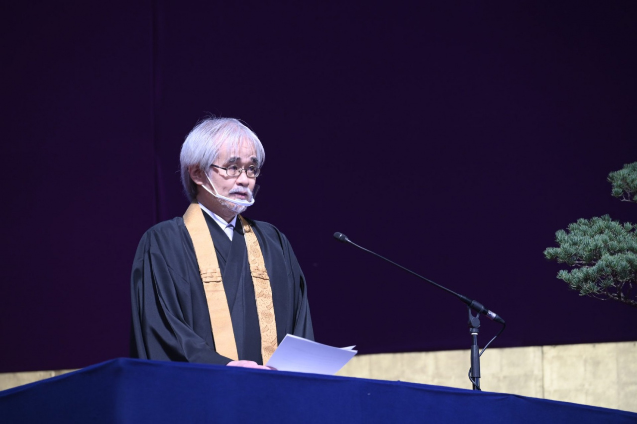 また、ボランティア活動、障がいのある友人への支援といった本学学生の取り組みを紹介し、「龍谷大学を特色づけるのは、他者と共に生きていく姿勢を形成しようとする空気」であると自省利他の考えを述べられたほか、未来社会を担う新入生に向けて、実り豊かな学生生活、研究生活を送られることを期待するメッセージを届けました。