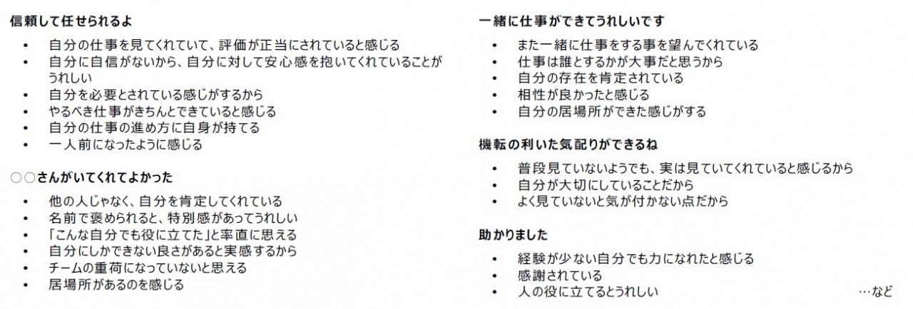 部下が好ましい行動をとった際には、上司は部下の欲求を満足させるような、部下への「感謝」「関心」「存在意義」を示すような声がけ(褒め言葉)ができるとよいでしょう。ただし、アンケートにあるような部下が好みそうな言葉を連発して、部下に気に入られようとすることは本質ではありません。組織を良好に保つために、部下に関心を持ち、部下に合わせた「感謝」を示すことで部下の行動を促し、組織のパフォーマンスを高めていくことが重要です。