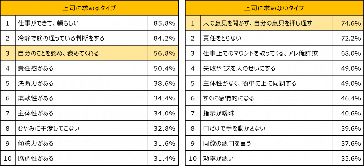 部下が求める上司、求めない上司ランキング:「自分のことを認め、褒めてくれる」上司を求め、「人の意見を聞かず、自分の意見を押し通す」上司を好まない。