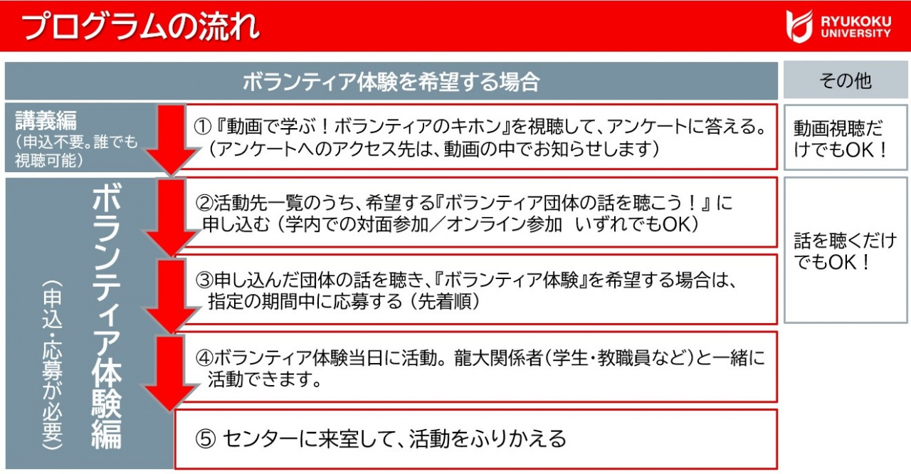 『ボランティア体験』(定員あり・要応募)のためには、『動画で学ぶ!ボランティアのキホン』の視聴とアンケート回答+『ボランティア団体の話を聴こう』への参加が必須!
