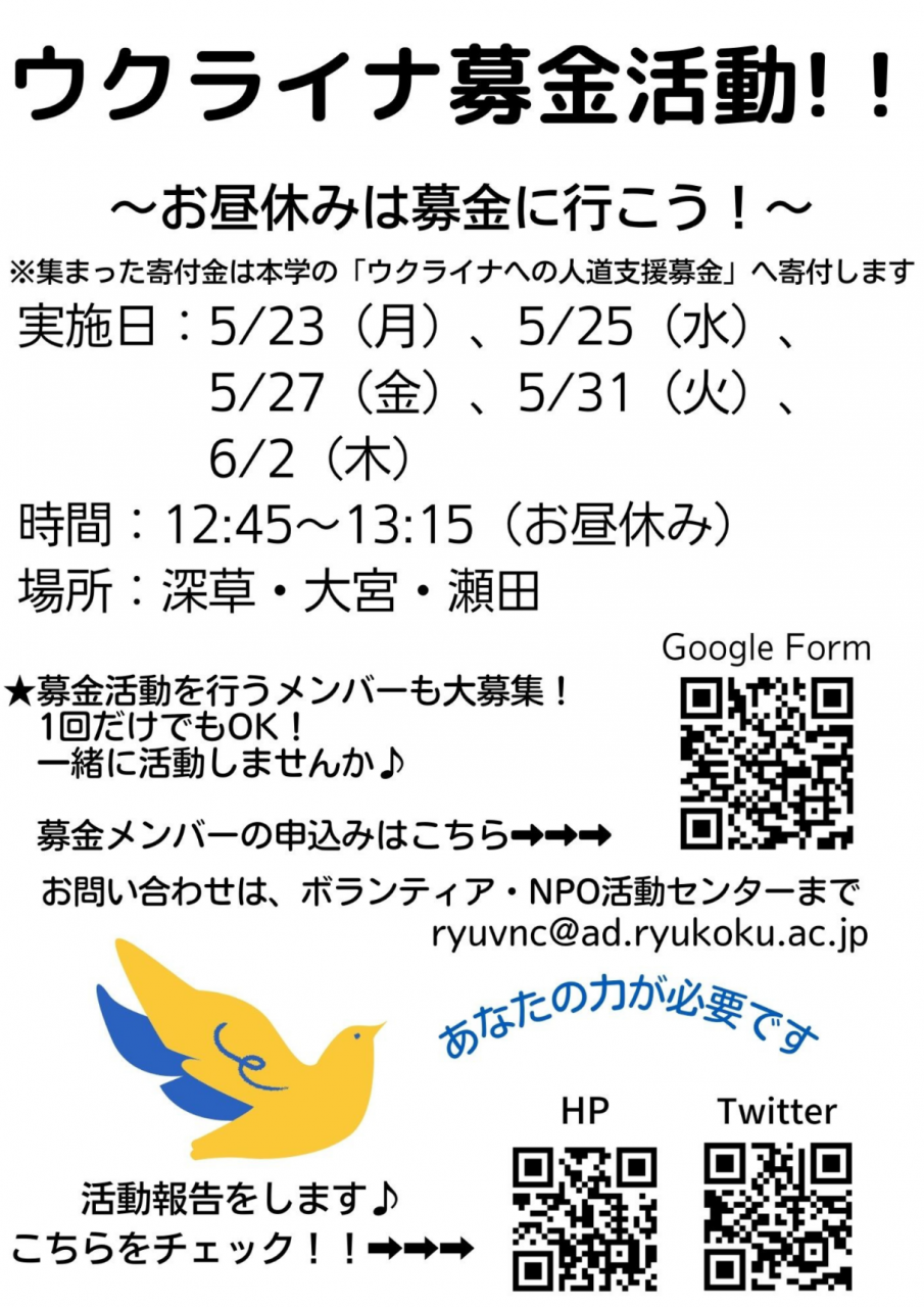 募金は、龍谷大学のウクライナへの人道支援募金へ寄付します。