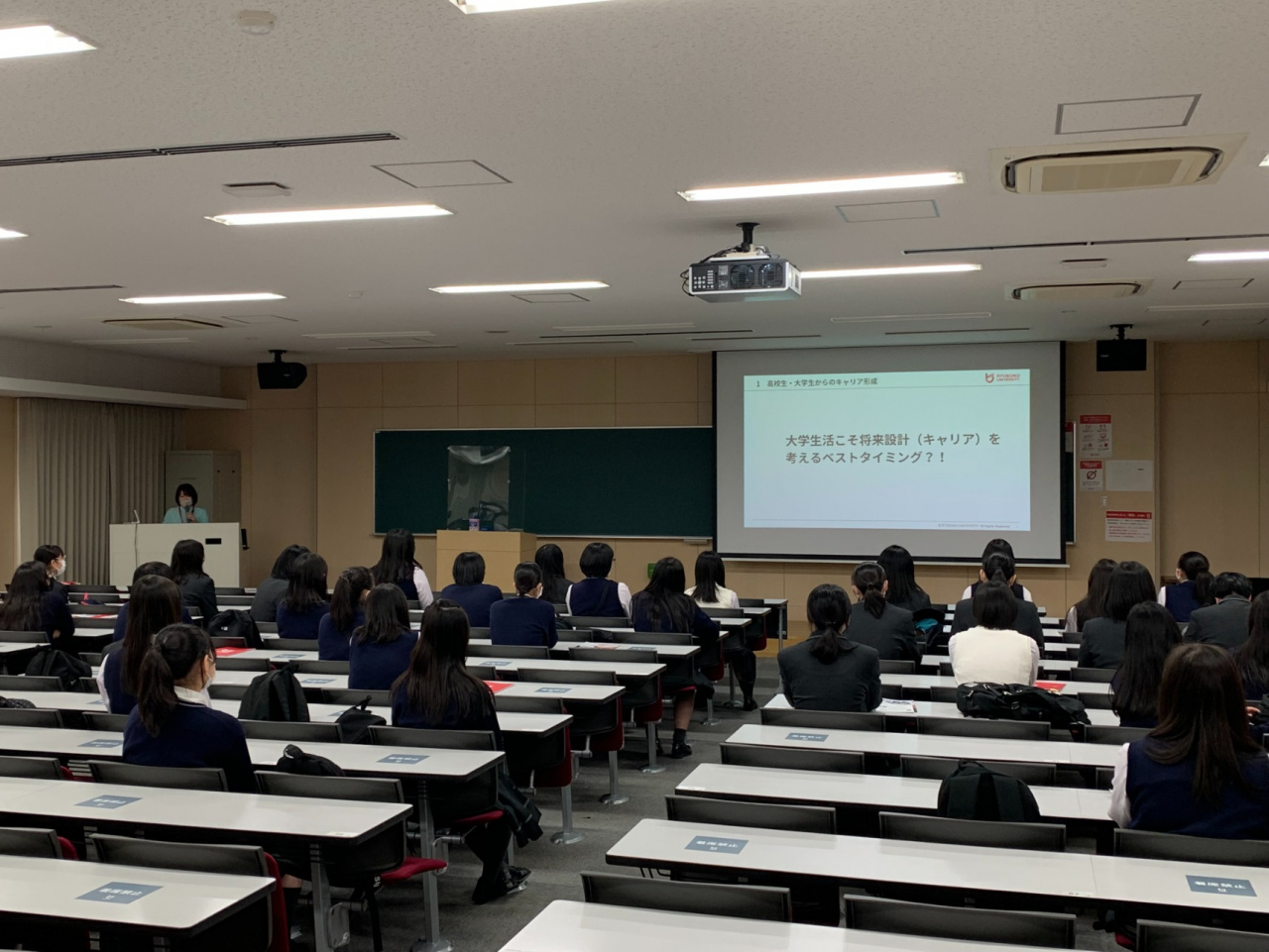 同じく宗門関係校である京都女子大学や相愛大学から希望する大学を選択し、本学へは46名の生徒が訪問しました。生徒らは午前中、龍谷大学の学部・学科や大学生のキャリア設計について説明を受けた後、学食を体験。午後からは同校の卒業生で現在は本学で学ぶ学生4名から大学選択の理由や学生生活について具体的な話を聞いた後、学生団体「アドミッション☆サポータ―」によるキャンパスツアーで大学の施設を見学しました。