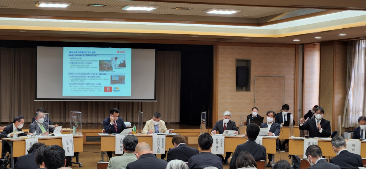 「意見交換会」では、大岡 敏孝 環境副大臣(滋賀県選出衆議院議員)がコーディネーターをつとめ、三日月 大造 滋賀県知事、佐藤 健司 大津市長、龍谷大学 深尾副学長、滋賀県商工会議所連合会長、地元企業役員などが参加し、脱炭素に係る意見交換が行われました。その後、大岡副大臣から総括が述べられ、その中で、「大学は毎年多くの若者を社会に輩出している。脱炭素社会の実現に向けた取り組みを数多く実践し、教育している龍谷大学には、これからの社会を担う人材の更なる育成に期待している」とのコメントをいただきました。