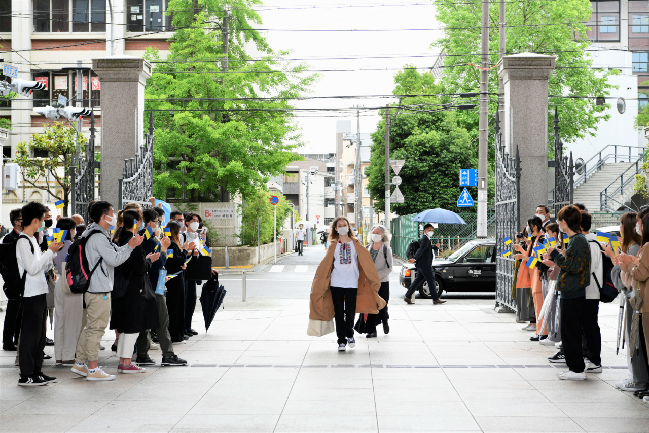 到着時には、歓迎セレモニーとして、キーウ市と姉妹都市である京都市の門川大作京都市長をはじめ、龍谷大学の学生・教職員とともにウクライナ国旗の手旗と横断幕で出迎え、歓迎の意を表しました。