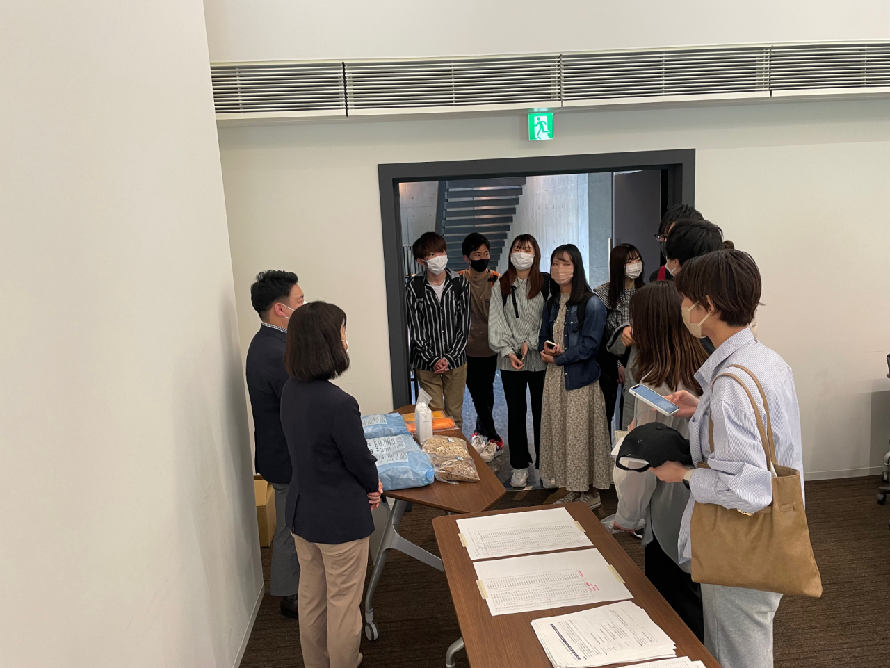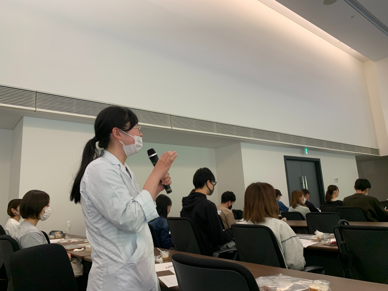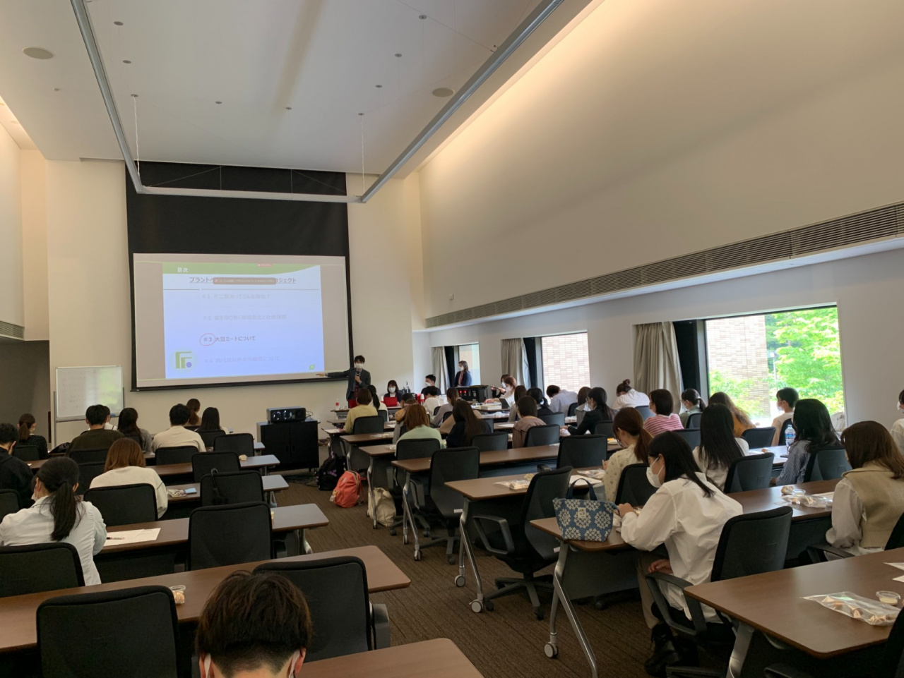 そのキックオフとして、不二製油株式会社の開発担当者3名にお越しいただき、同社の事業概要や、食料資源をとりまく環境変化と社会課題などについてご講演いただきました。講演の中では、大豆ミートを使用した料理や豆乳のクリームなどプラントベース素材を実際に試食しながら、近年国内に広がりを見せている大豆ミート市場について実例をご紹介いただきました。当日は学科の垣根を超えて、農学部生約80名と短大生6名(オンライン)が参加し、講演終了後も列になって講師の方に質問をしていました。