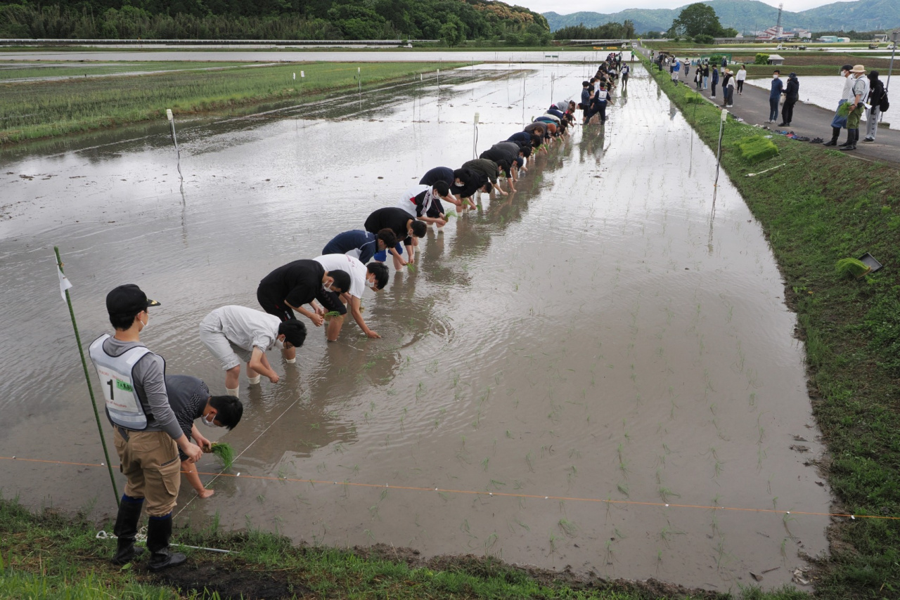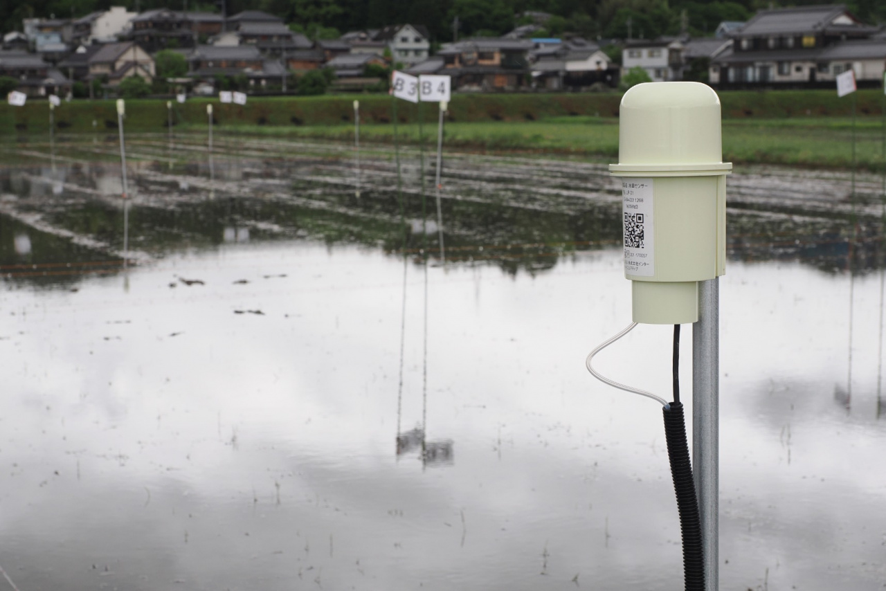 5月14日(土)、農学部牧農場において「食の循環実習Ⅰ」の一環で田植えを実施(1年次約450名が参加)しました。5月の田植えはすべての1年次を対象に毎年実施していますが、2022年度は文部科学省/大学改革推進等補助金「デジタルと専門分野の掛け合わせによる産業DXをけん引する高度専門人材育成事業」(以下「アグリDX」)の採択を受け、水田センサー等を設置するなど、スマート農業の一端を体験しながら取り組みました。水田センサーで測定した水位や水温データは無線経由でクラウドに蓄積され、スマートフォンのアプリで確認することができます。田植えに参加した学生(1年生)は、指導教員からスマートフォンで表示されるデータを見ておどろきの表情をうかべていました。