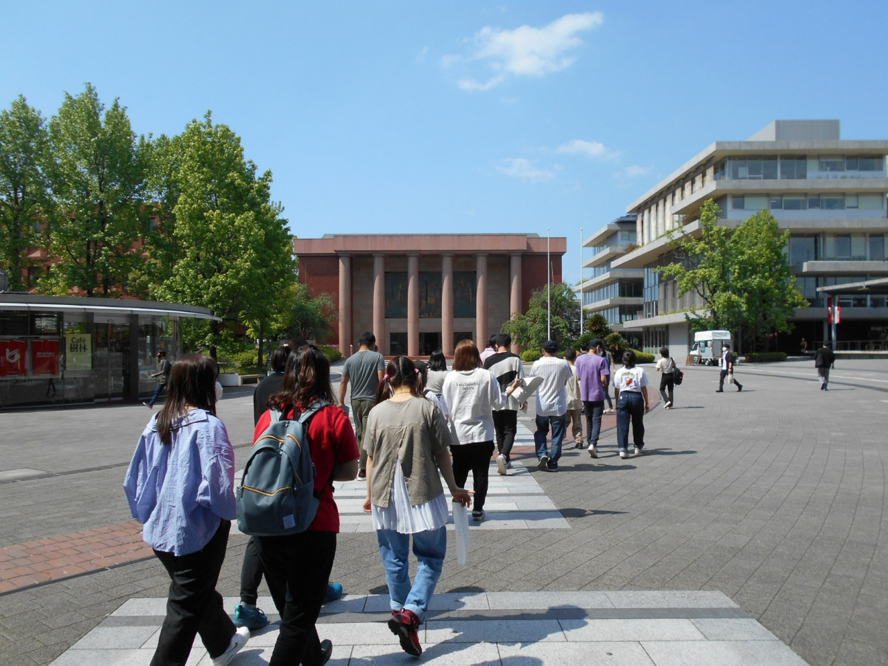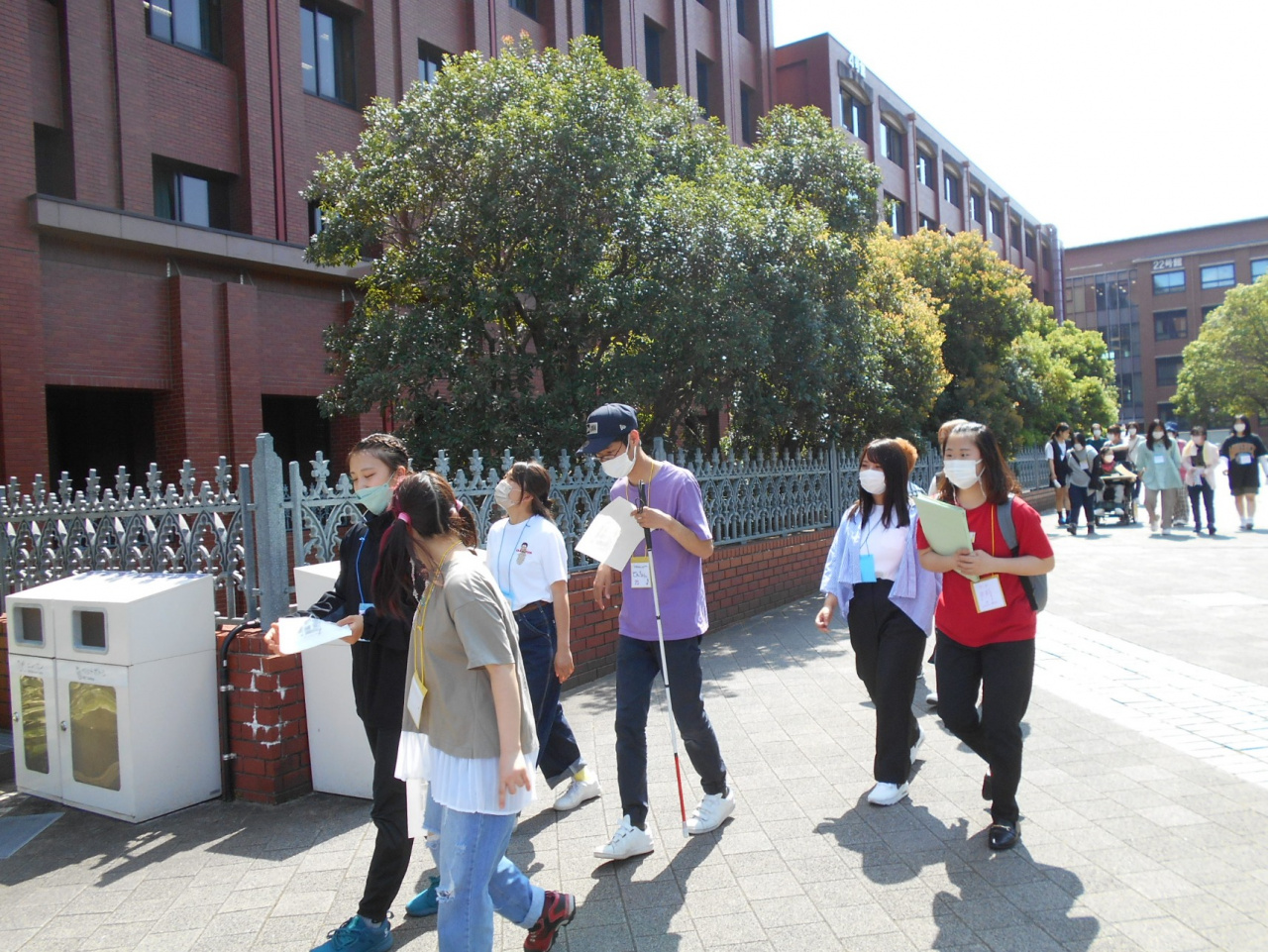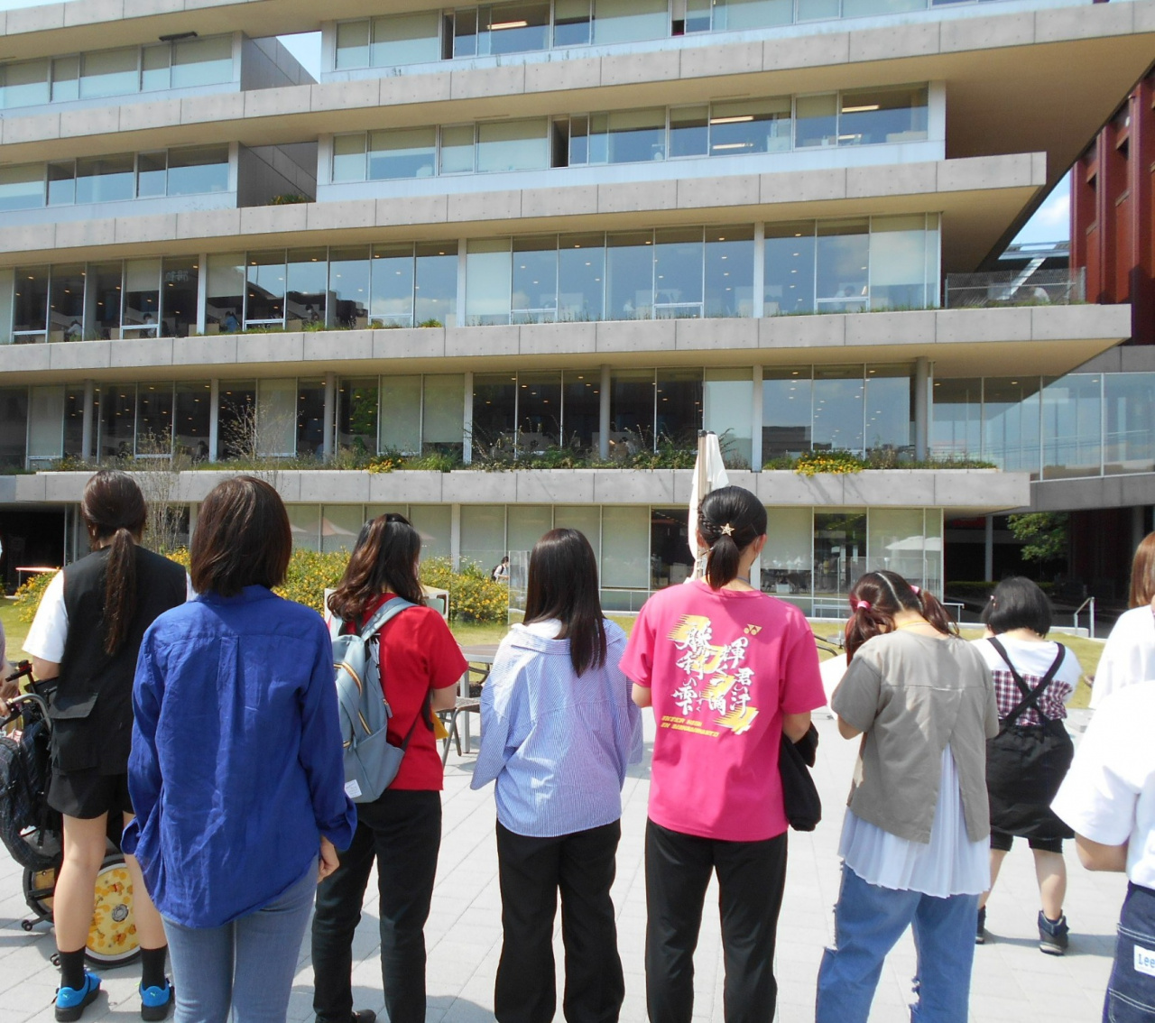 地域に暮らす知的障がいのある方々と学生が共に学ぶ「オープンカレッジふれあい大学課程」では、2022年5月24日に「キャンパス体験!フィールドワーク♪」の授業を行いました。まず、教室で龍谷大学の歴史を学び、次に、キャンパスマップを使って、よく使う場所や移動するときに目印になる場所などを確認しました。その後、汗ばむくらいのいいお天気の中、キャンパス内を見学しました。ふれあい生と短大生がともに行動することで、お互いに交流を深めることができました。