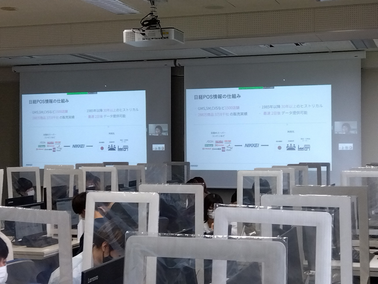 経済学部では、データを活用して社会やビジネスの課題を解決していけるような人材の育成に取り組んでおり、データ分析に関連した様々な講義や講演会を行っています。その一環として、5月11日(水)の「データ分析と問題解決」の講義において、日本経済新聞社情報サービスユニット担当部長の久慈未穂氏をお招きし、ワークショップを開催しました。