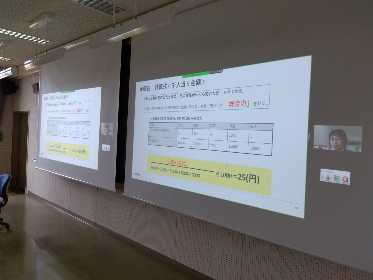 ビジネスの現場において急速に拡大しているビッグデータビジネスの現状と今後の課題について説明の後に、POSデータを用いたデータ分析のポイントについて解説していただきました。次回のワークショップまでに、NEEDS-SCANスポットデータ(ポテトチップスの週次販売データ)を用い、グループごとにデータ分析を進め、具体的な提案をまとめて報告することになりました。