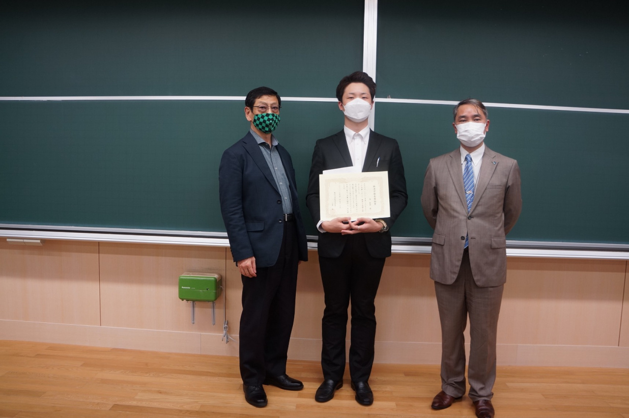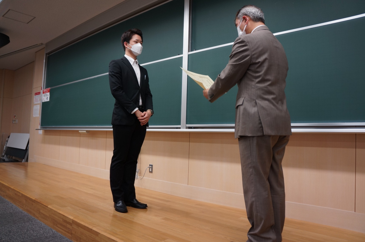 表彰式は経済学部教授会の冒頭で行われ、小峯 敦 経済学部長より賞状と記念品、経済学部同窓会からの副賞が贈呈された後、小峯学部長や竹中教授、受賞者のゼミ担当である大原教授からお祝いと激励のメッセージが送られました。