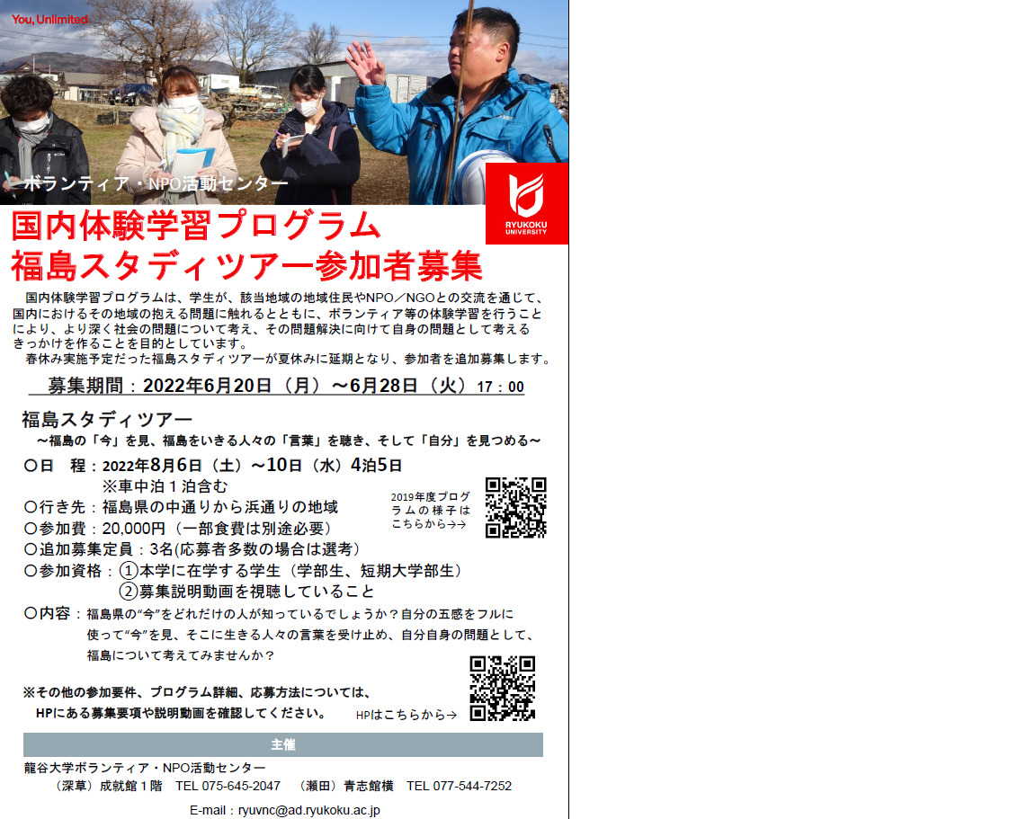 当センターでは、国内体験学習プログラムとして、21年度の春休みに福島スタディツアーを実施する予定にしていました。しかし、コロナ禍のために延期になり、夏休みに実施することになりました。 今回は、延期に伴い参加者の追加募集を行います。 国内体験学習プログラムは、学生が、該当地域の地域住民やNPO/NGOとの交流を通じて、国内におけるその地域の抱える問題に触れるとともに、ボランティア等の体験学習を行うことにより、より深く社会の問題について考え、その問題解決に向けて自身の問題として考えるきっかけを作ることを目的としています。 ぜひ一緒に地域へ出て、見て、聴いて、感じてみませんか?