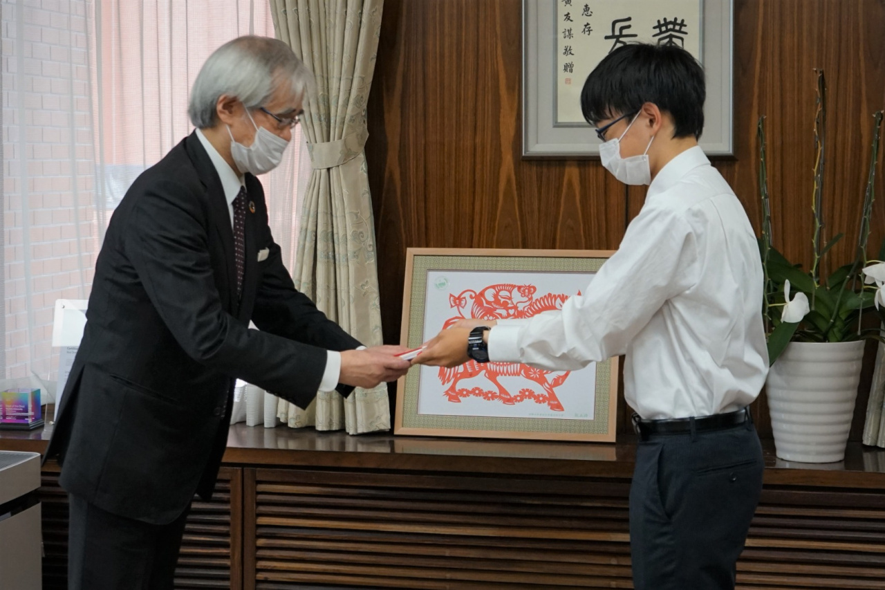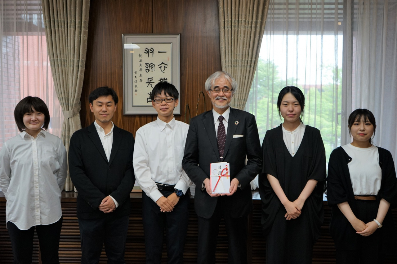 このたび、ご寄付をいただいた皆様、また、募金活動に参加していただいた学生を代表して、今回の活動で集まった全額を龍谷大学がおこなっている「ウクライナへの人道支援募金」へ寄付すべく、目録を学長に贈呈いたしました。