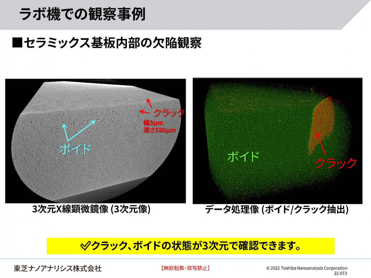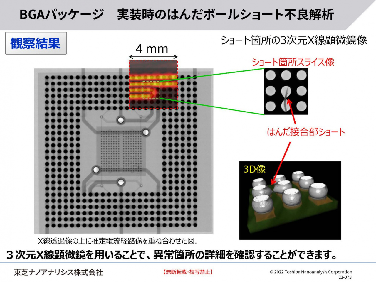 また、最新の分析・解析技術と最新鋭の設備を駆使し、半導体・液晶・金属・新素材を中核としたナノレベルの微細加工、分析、解析、信頼性評価などを行われている東芝ナノアナリシス株式会社の鈴木様からは、磁場顕微鏡及び3次元X線顕微鏡(X線CT)用いた非破壊観察技術を中心に、実例を交えながらご講演をいただきました。内部状態を3次元的に可視化する3次元X線顕微鏡の観察事例の一つとして、産業のコメと言われている半導体の品質や歩留にかかわるチップの実装材料のボイド解析(図3)やパッケージの接続不良解析(図4)への適用をご紹介いただきました。最先端の電子材料や製品を研究開発されている聴講者からは、結晶欠陥や元素分析に関して熱心な質問がありました。