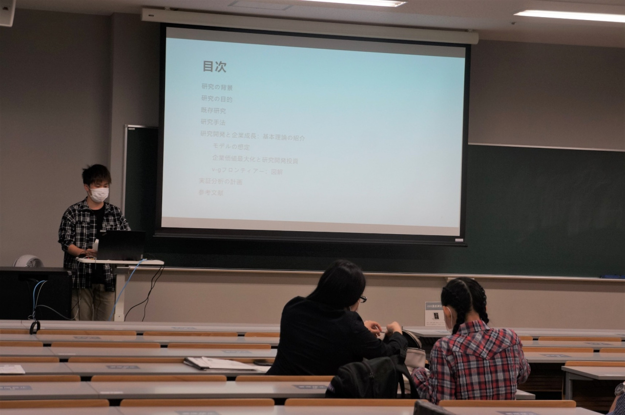 経済学研究科では、合同演習での発表を修了要件の一つと位置付けており、修士課程は2回以上、博士後期課程は3回以上、発表することが必須となっています。発表者は、この場を通じて得た成果を活かし、今後の論文作成に取り組んでいくこととなります。